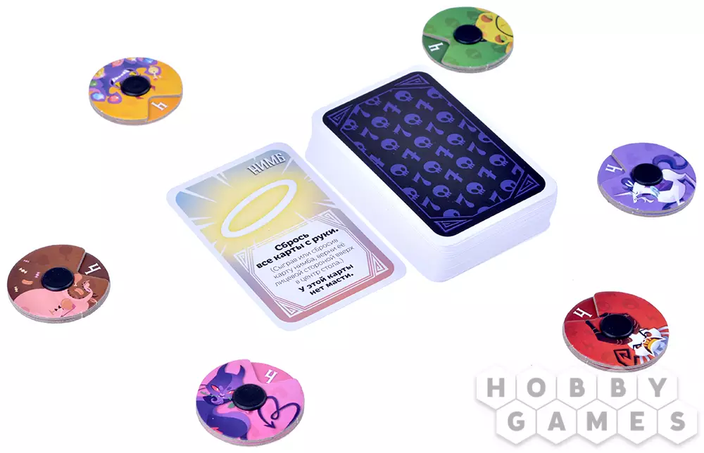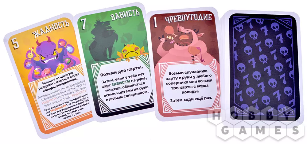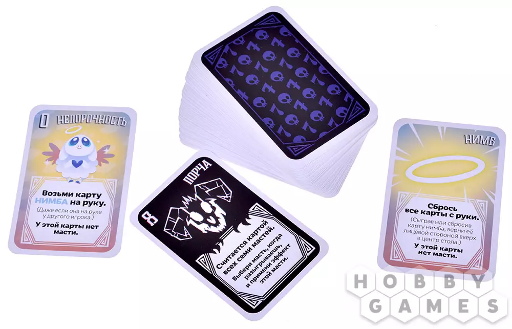 В колоде вас ждёт 52 карты грешочков: 49 карт семи всем известных грехов (мастей) разной степени тяжести (со значениями от 1 до 7), карта "Порчи", которая поможет вам усилить эффект вашей пакости, ведь она является джокером и считается картой любой масти. А ещё карта "Нимба", которая освобождает вас от карт на руках и снижает уровень порока, и карта "Непорочности", которая поможет вам получить эту самую карту "Нимба".