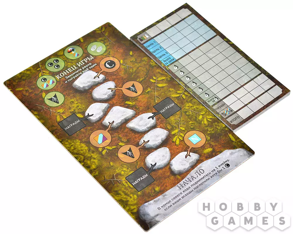 Игра завершается, когда один из участников достигает края планшета углерода, после чего у всех есть последний шанс укрепить свои позиции. Победителем становится игрок, набравший наибольшее количество очков к концу игры. Сравнивайте достижения – и пусть победит самый мудрый хранитель леса!
