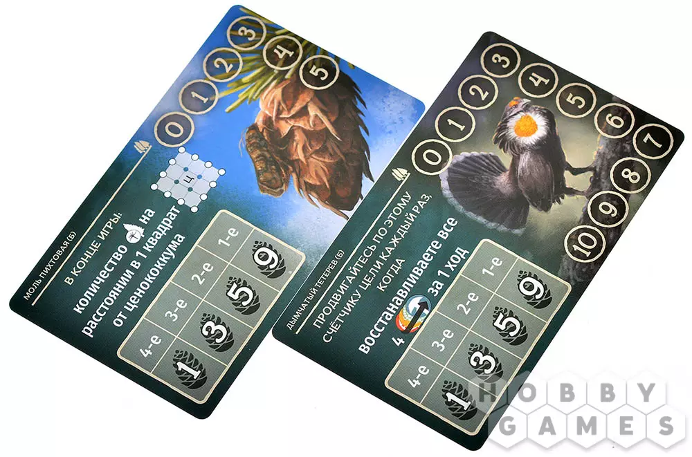 Игра завершается, когда один из участников достигает края планшета углерода, после чего у всех есть последний шанс укрепить свои позиции. Победителем становится игрок, набравший наибольшее количество очков к концу игры. Сравнивайте достижения – и пусть победит самый мудрый хранитель леса!