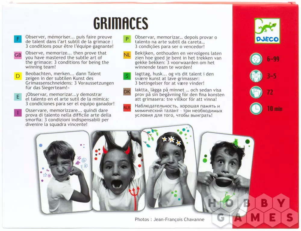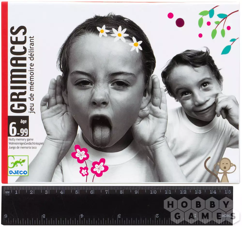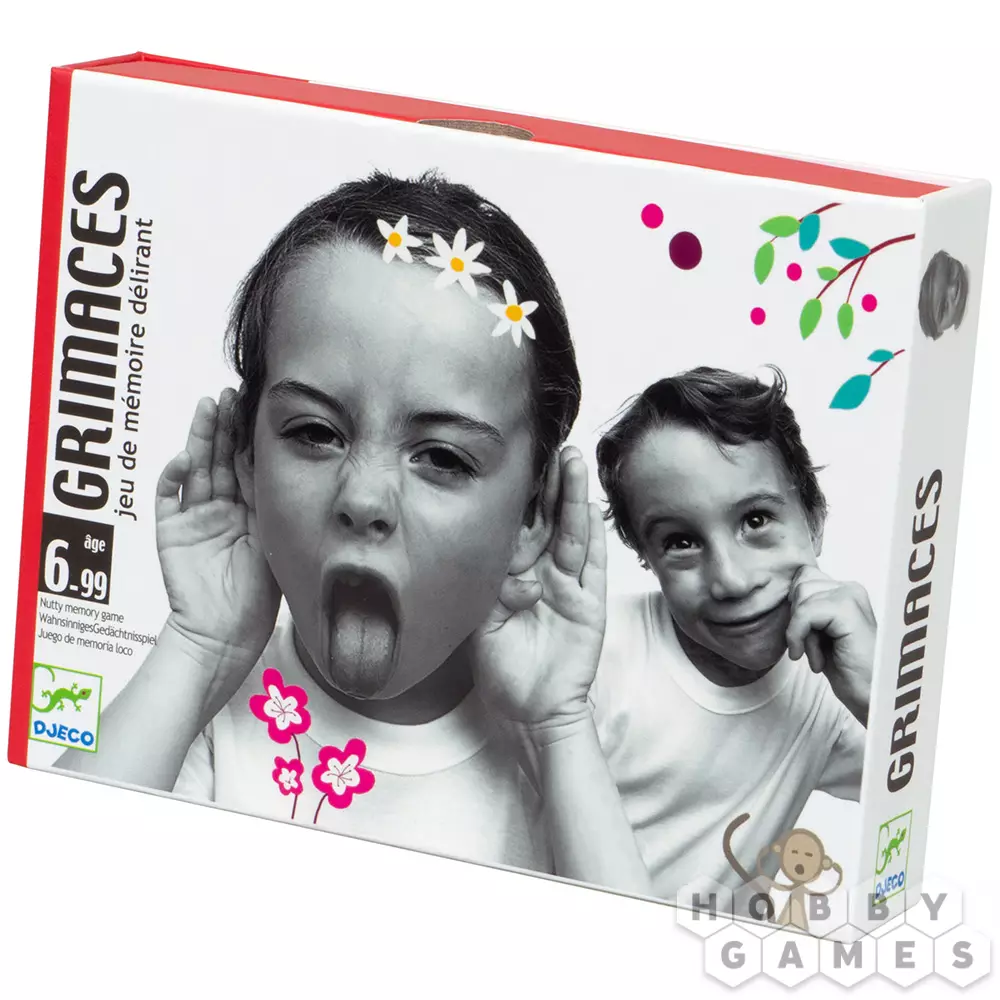 Grimaces – весёлая игра для детской компании от 3 до 5 человек. В неё можно играть как командой против команды, так и всем вместе. В игре 72 карты с изображенными на них весёлыми, грустными, злыми и прочими гримасами. Одни игроки будут показывать другим, что изображено на картах, остальные – будут стараться угадать. Побеждает команда или игрок, угадавший больше всего карт.