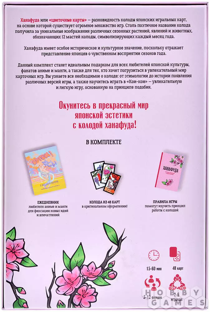 "Ханафуда" – это древняя игра, основанная на традициях японской культуры. В ней гармонично переплетаются чувственная привязанность народа к природе, к её циклическим изменениям и уникальные иллюстрации соответствующих сезонных явлений, растений и существ. Каждая карта из набора олицетворяет определённый месяц года в своём уникальном амплуа.