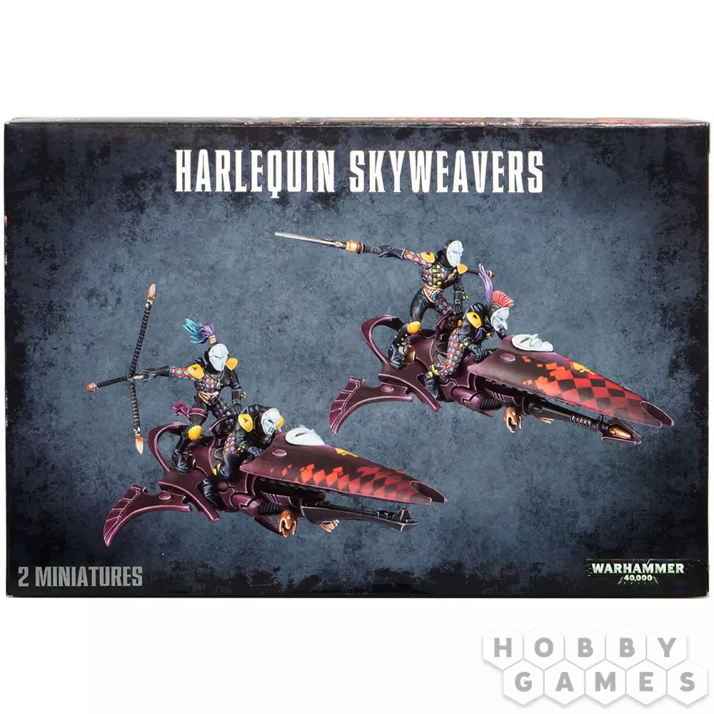 С помощью этого набора, состоящего из 84 деталей, вы сможете собрать две миниатюры Harlequin Skyweavers, каждая из которых включает в себя пилота и пассажира. Каждый Skyweaver вооружён сюрикен-пушкой и ракетницей миражей, при этом сюрикен-пушки могут быть заменены на пушки haywire. В наборе имеются 5 различных голов и 7 уникальных масок.