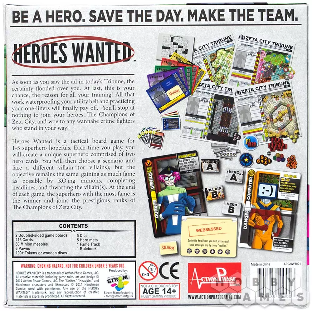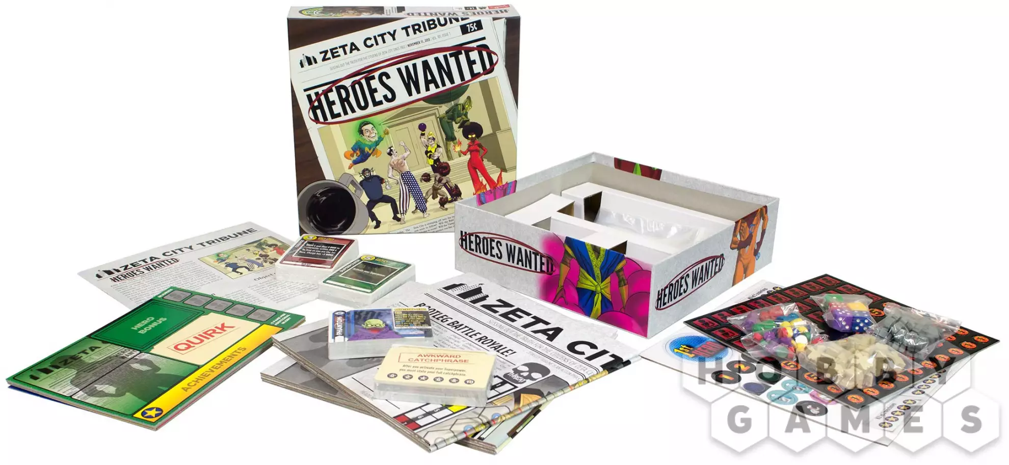 Heroes Wanted – тактическая настольная игра для супергероя или целой команды до пяти сверхлюдей. Каждый герой определяется двумя карточками головы и тела, которые определят его физиологию и способности, например, Яростный Гений может не только обрушить на врага большой урон, но и напарников задеть.