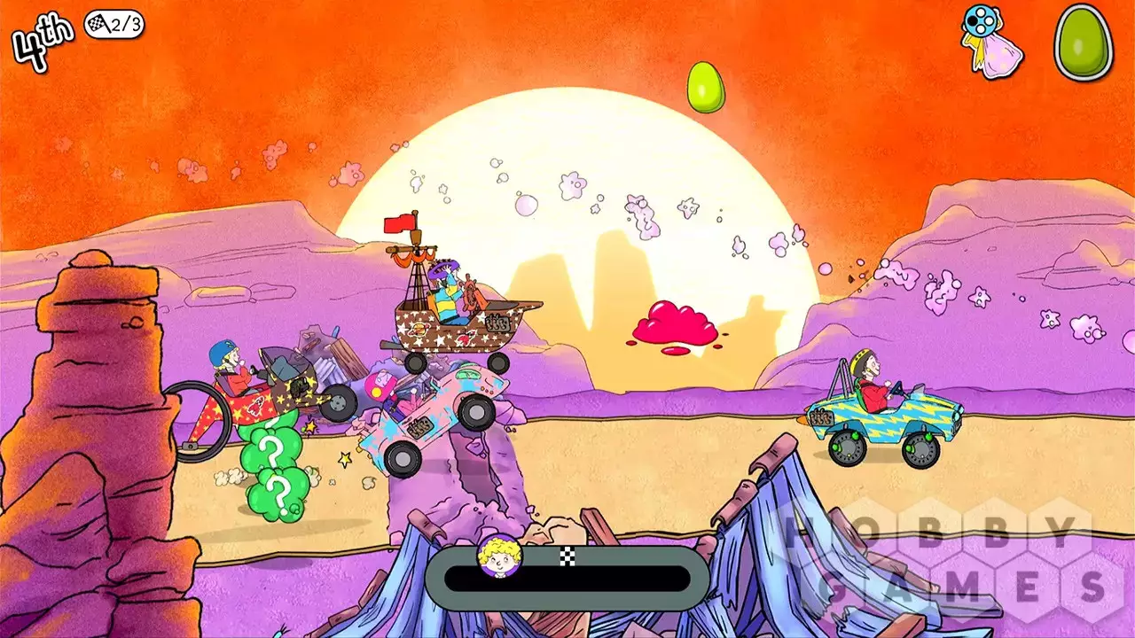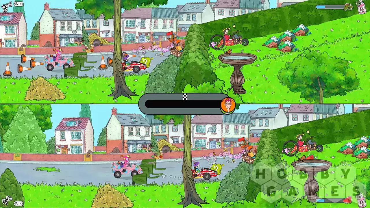Play 8 mighty bonus games to unlock terrific tricks and power-ups to use in the same race. Foam Fungus Fizz, Smelly Snot Slime, Gross Goo, Banana Skid, Bedspring Bounce, Slime Squirt, Snotbag Slinger and Perfect Plane. Which one will be your favourite?