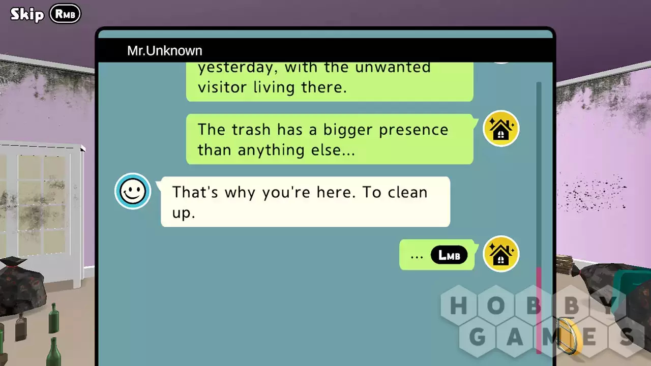 One day, our freshly unemployed main protagonist receives a message from a strange character, asking for...house cleaning?