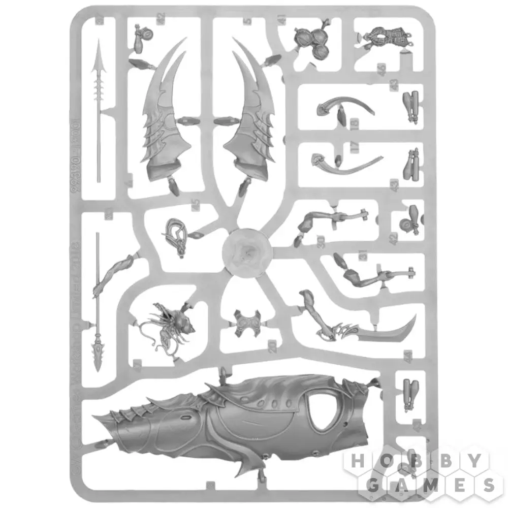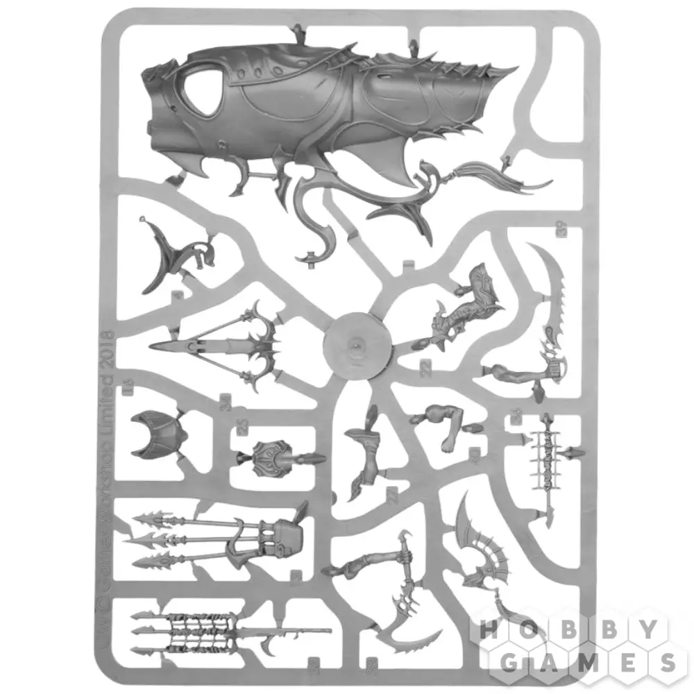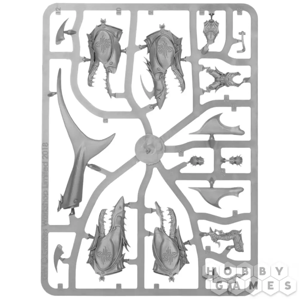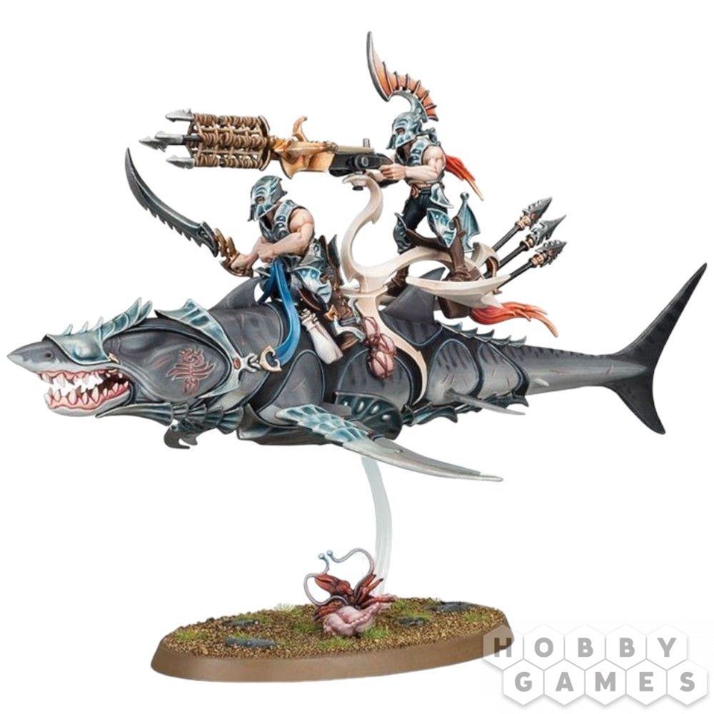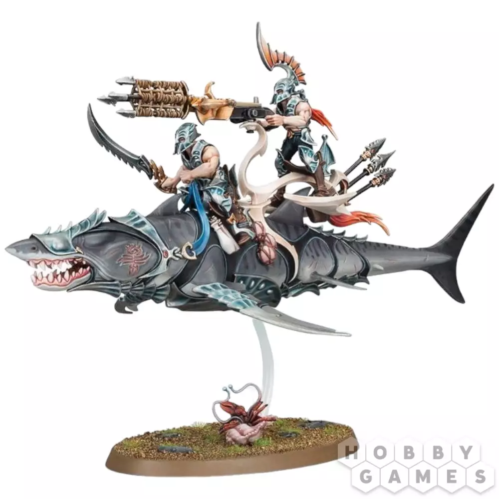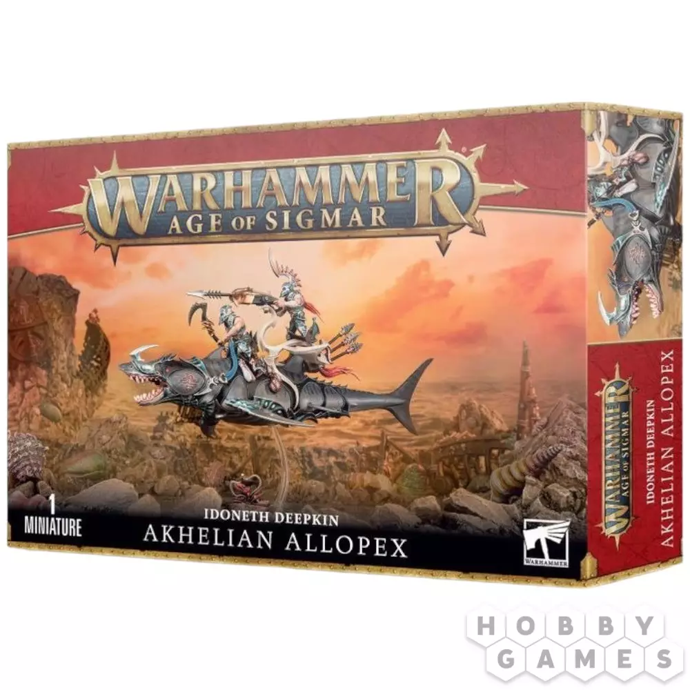 Этот многокомпонентный пластиковый набор содержит детали, необходимые для сборки Акхелийского Аллопекса. Это создание – огромный свирепый зверь, похожий на акулу. Его плавники снабжены острыми клинками, а его голову и глаза покрывает стальная пластина, необходимая, чтобы облегчить контроль над зверем наездниками. Два акхелийских стража восседают верхом на аллопексе – первый в левой руке держит поводья, а в правой – шипастое лезвие или крюк на выбор, предназначенные для устранения ближайшего противника, которого не настигли острые клыки аллопекса. Позади него на специальной платформе располагается второй страж с гарпуном, который можно собрать в качестве метателя сетей – оба устройства одинаково разрушительны и содержат набор гарпунов. Первый наездник оснащен шлемом без гребня, что позволяет второму стражу сделать четкий выстрел без помех, а шлем стрелка, наоборот, украшен особенно большим гребнем; оба наездника облачены в тяжелые стальные пластины, а руки их остаются открытыми, что характерно для Акхелианских Стражей. Модель Аллопекса можно собрать с закрытым или открытым ртом на выбор. Также в комплекте содержится несколько дополнений – рыболовная сеть, веревка, крюк для захвата, различные сосуды и футляр для них, которые можно использовать для украшения базы и самой миниатюры.