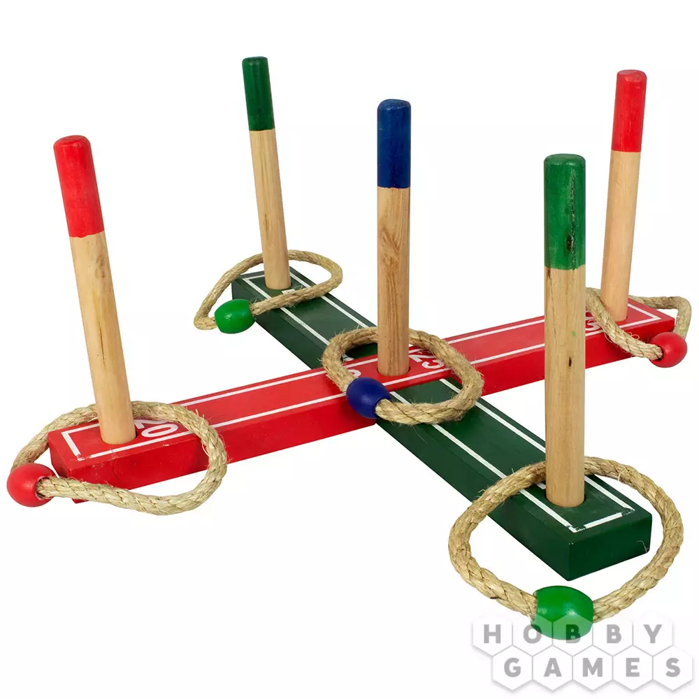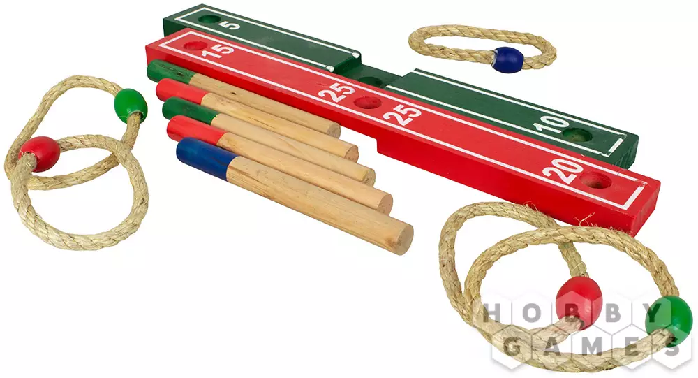 В "кольцеброс" желательно играть на открытом воздухе, хотя и в обычной квартире он не потребует много места. Правила этой игры максимально просты – сперва собирается деревянная "мишень" с вертикальными колышками. Участники, отойдя на определённое расстояние, по очереди кидают по пять верёвочных колечек, стремясь попасть в центр и набрать максимальное количество баллов – 25. Так игра идёт до тех пор, пока один из участников не наберёт определённое количество очков.