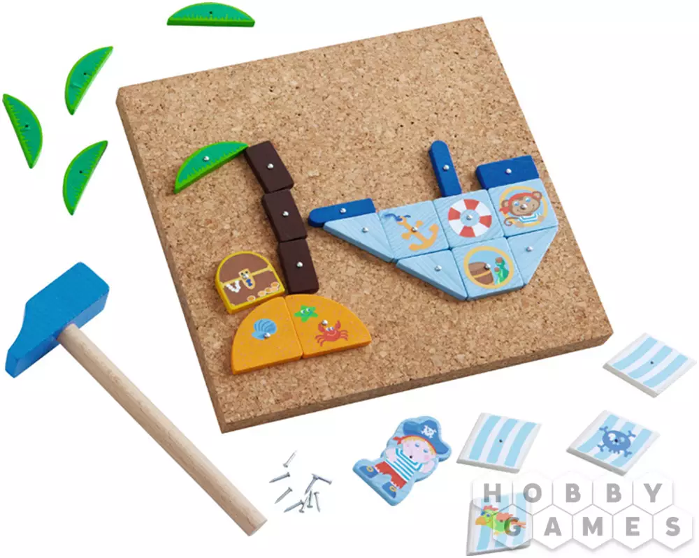 Озорной капитан ведет свой гордый пиратский корабль. Земля! Это остров сокровищ! Игра-конструктор стимулирует фантазию вашего ребенка и разовьет его концентрацию и мелкую моторику, ведь фигурки нужно вбивать в пробковую доску безопасными молоточком и гвоздиками.