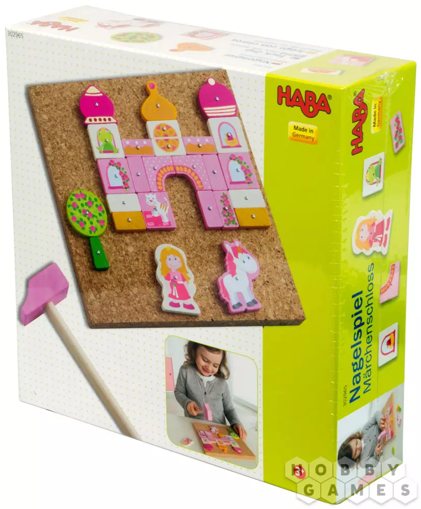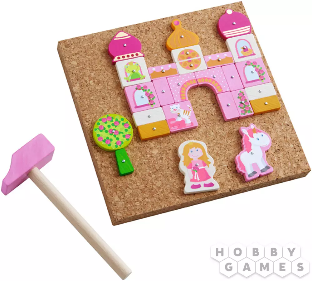 Маленькая принцесса обожает свой сказочный замок, где она играет со своим единорогом, лягушкой и кошкой. Игра-конструктор стимулирует фантазию вашего ребенка и разовьет его концентрацию и мелкую моторику, ведь фигурки нужно вбивать в пробковую доску безопасными молоточком и гвоздиками.