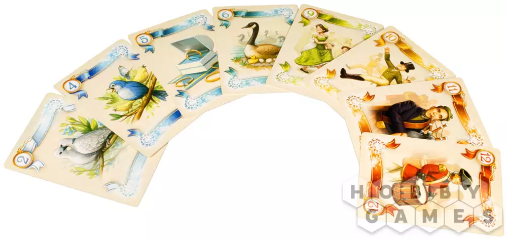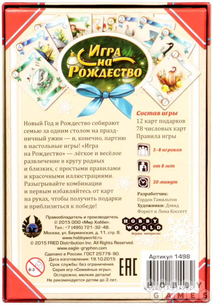 В "Игру на Рождество" играют специальными картами, на которых изображены персонажи рождественской песни. Ваша цель – избавиться от карт раньше других игроков. Это проще сделать, если вы – первый игрок-запевала и начинаете раунд. Если в предыдущем раунде вы сыграли карту с самым низким значением, то становитесь запевалой в текущем. Будьте внимательны, карт с низкими значениями немного – а куропатка на грушевом дереве всего одна.
