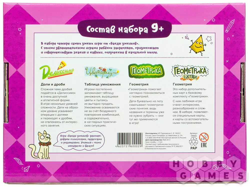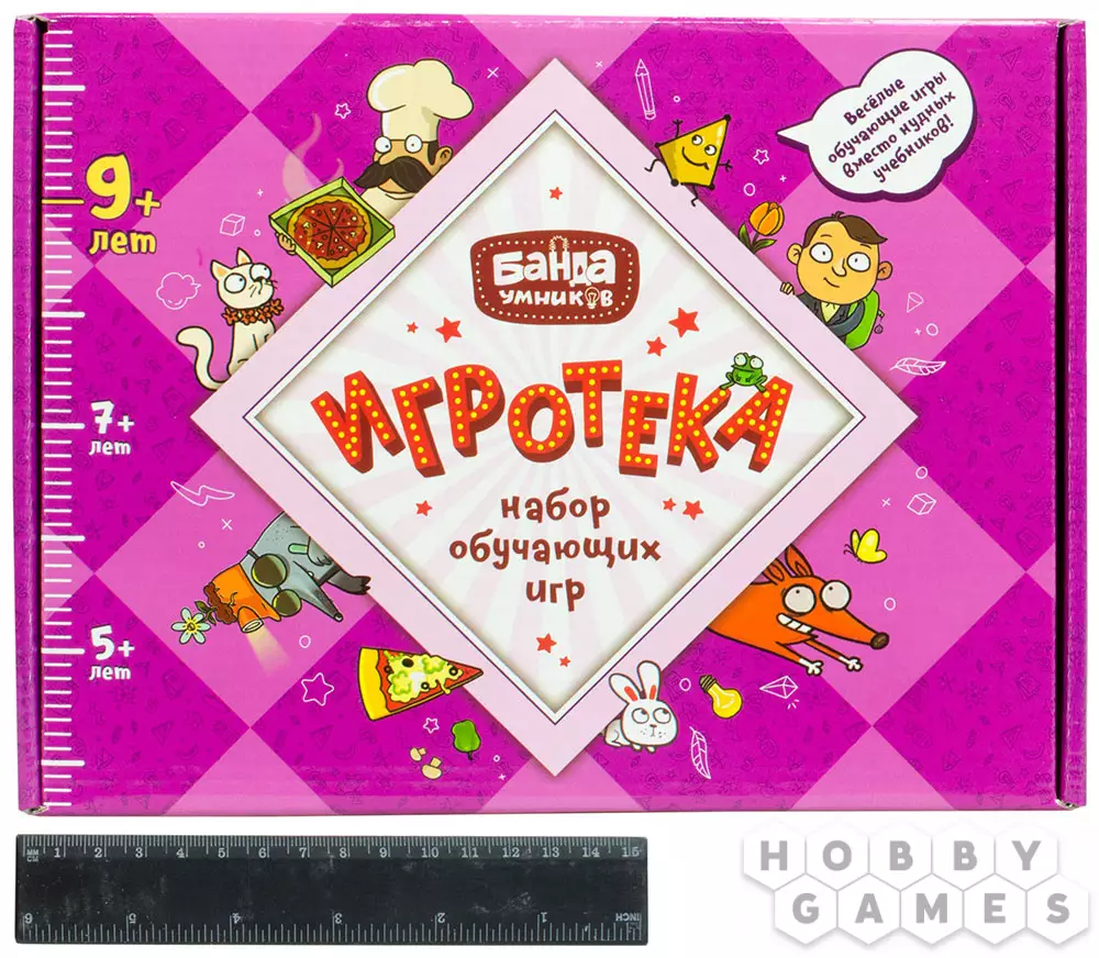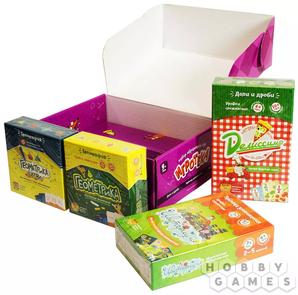 Представляем вашему вниманию набор "Игротека 9+", состоящий из четырёх замечательных игр, которые помогут школьникам начальных классов закрепить и приумножить полученный багаж знаний. Настольные игры из этой коробки обучат необходимым основам математики, таким как доли и дроби, а также подтянут и помогут запомнить таблицу умножения. Плюс к этому, вы найдёте две игры для изучения геометрии – от начального к среднему уровню. Всё обучение происходит в лёгкой и интересной игровой форме. Таким образом, ребёнок в процессе игры и сами не замечает, как учится. Этот набор обучающих игр подойдёт для детей от девяти лет и старше.