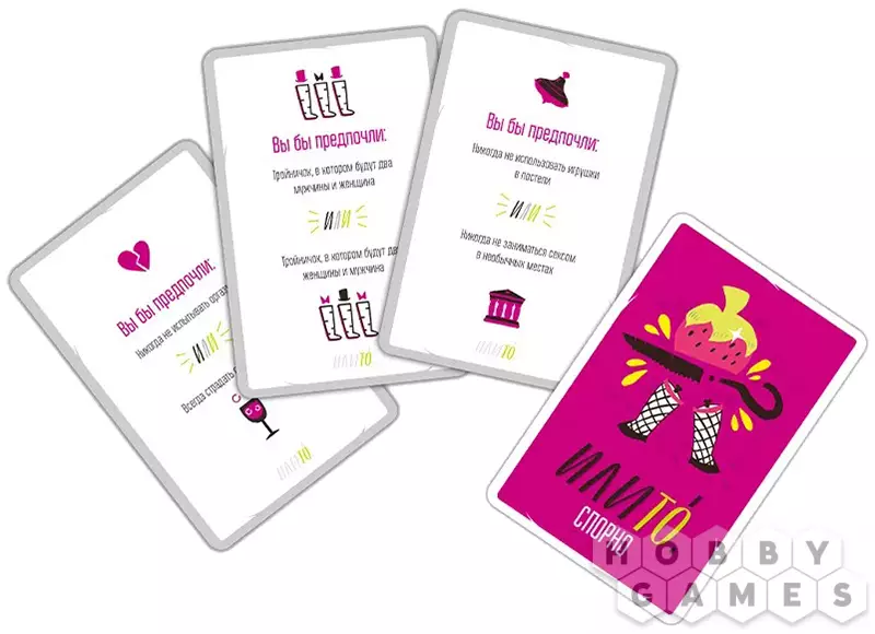 Как это всё устроено? Да очень просто: первый игрок тянет карту и зачитывает ну очень неудобный вопрос с двумя вариантами выбора. Остальные участники по очереди выбирают меньшее из зол (конечно же, на их взгляд) и аргументируют свой ответ. Важно быть максимально убедительным, ведь задача остальных склонить на свою сторону ведущего: после всех ответов он озвучивает свой выбор и указывает игрока, чьи аргументы были для него более вескими – он получает карточку вопроса и победное очко! Ну а затем ведущий меняется, а жаркие споры продолжаются!