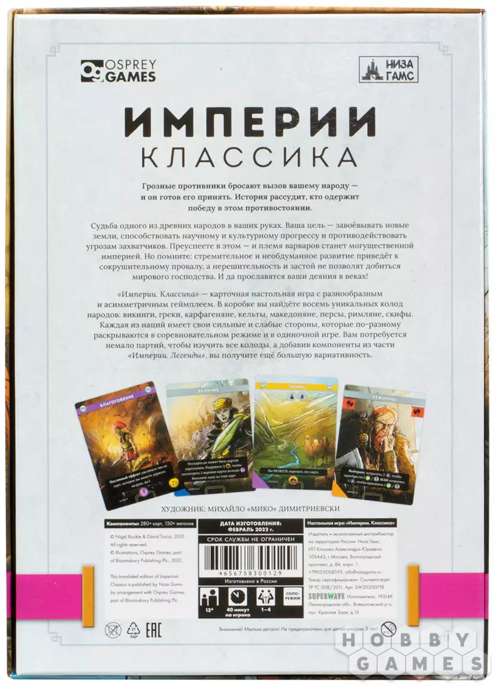 "Империи: Классика" – это многогранная карточная стратегия от Давида Турци, упор в которой сделан на асимметрию фракций. У всех восьми народов игры свои уникальные колоды с сильными и слабыми сторонами, которые можно очень долго изучать в ходе игры. Выявите оптимальные стратегии игры за римлян, греков, персов, карфагенян, скифов, викингов, македонян и кельтов! У игры есть отдельные правила для одиночной игры, причём соло-режим высоко оценён сообществом настольщиков, а ещё она отлично раскрывается в дуэльном противостоянии.