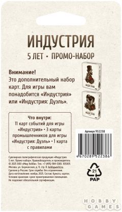 Что же ждёт вас внутри этого юбилейного конверта? В набор входят одиннадцать новых карт событий для базовой "Индустрии", которые внесут свежую струю в каждую партию, и три уникальные карты промышленников для "Индустрии: Дуэль", дарящие новые стратегические возможности для противостояния один на один.