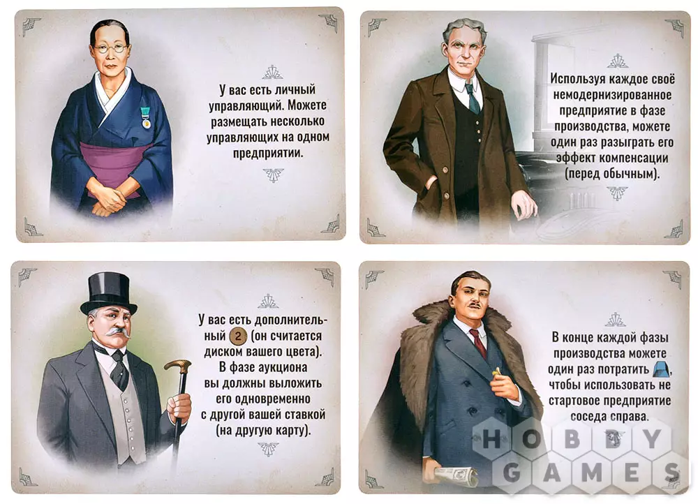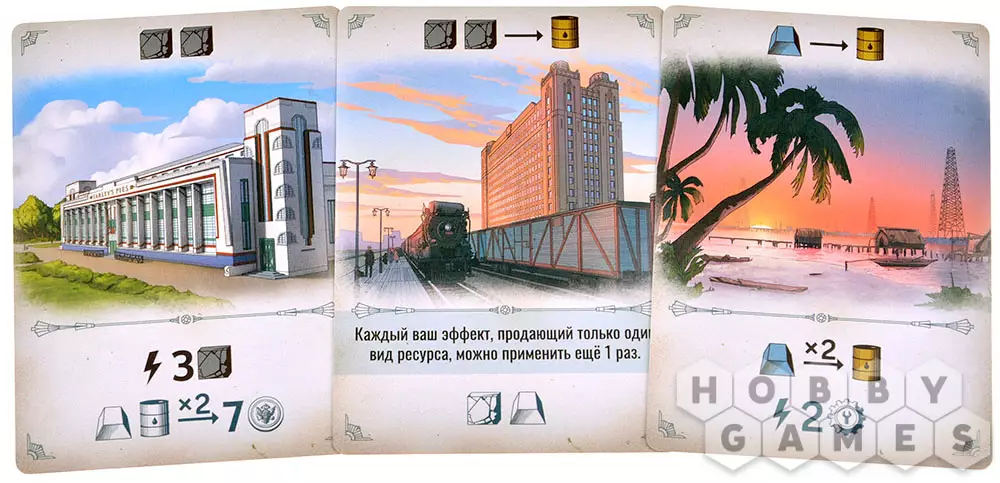 В правилах игры вы также найдёте вариации, призванные усложнить процесс для более опытных игроков. Кроме того, стоит отметить красочные иллюстрации на картах предприятий. Для многих из них основой стали изображения реальных промышленных комплексов рубежа XIX–XX веков. Они стали архитектурным гимном эпохи инженеров и предпринимателей, пара и электричества, первых автомобилей и трансконтинентальных железных дорог.