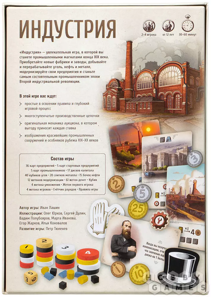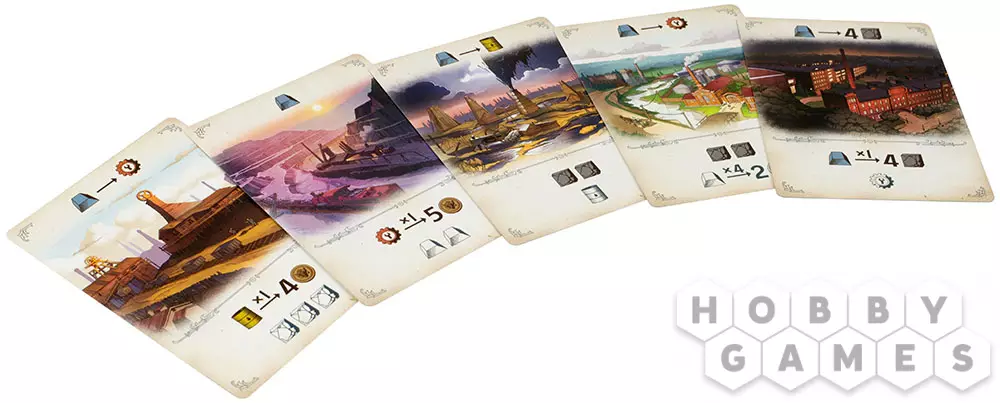 В правилах игры вы также найдёте вариации, призванные усложнить процесс для более опытных игроков. Кроме того, стоит отметить красочные иллюстрации на картах предприятий. Для многих из них основой стали изображения реальных промышленных комплексов рубежа XIX–XX веков. Они стали архитектурным гимном эпохи инженеров и предпринимателей, пара и электричества, первых автомобилей и трансконтинентальных железных дорог.