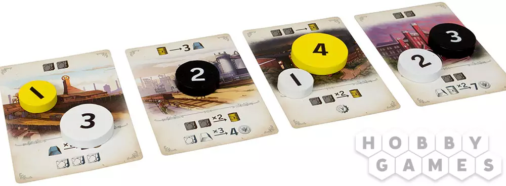 Фаза производства – следующий этап, в рамках которого игроки используют имеющиеся в активе карты строения для получения и переработки ресурсов. Ориентируясь на указанные в картах условия, вы сможете зарабатывать деньги за переработку ресурсов, либо пустить их на модернизацию самих предприятий. Модернизированные предприятия дадут вам больше вариаций по переработке ресурсов в последующих раундах, и вы сможете разработать собственную эффективную последовательность промышленной капитализации.