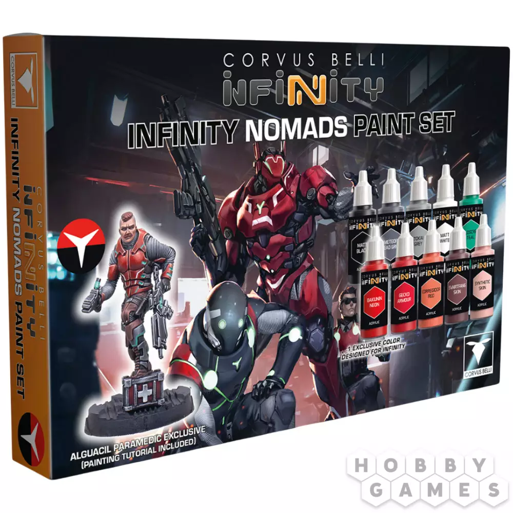 Infinity: Nomads Paint Set (Alguacil Paramedic Exclusive) – набор, в котором есть всё необходимое, чтобы передать дерзкий и яркий стиль Nomads на поле боя Infinity. Главная особенность – эксклюзивная миниатюра Alguacil (Paramedic), которую можно найти только в этом наборе.