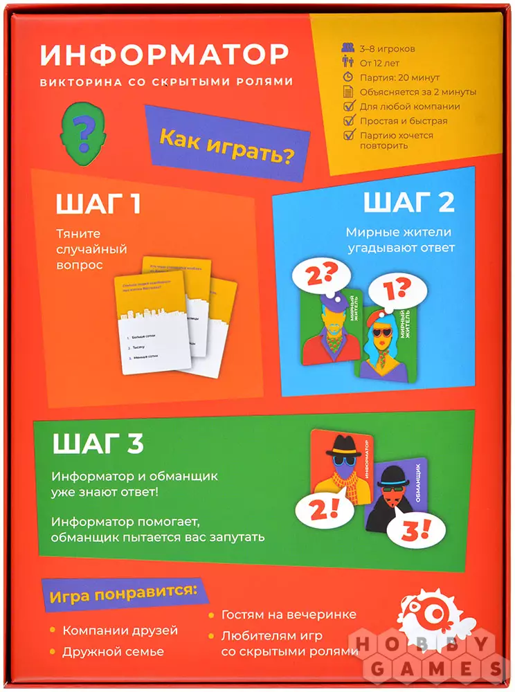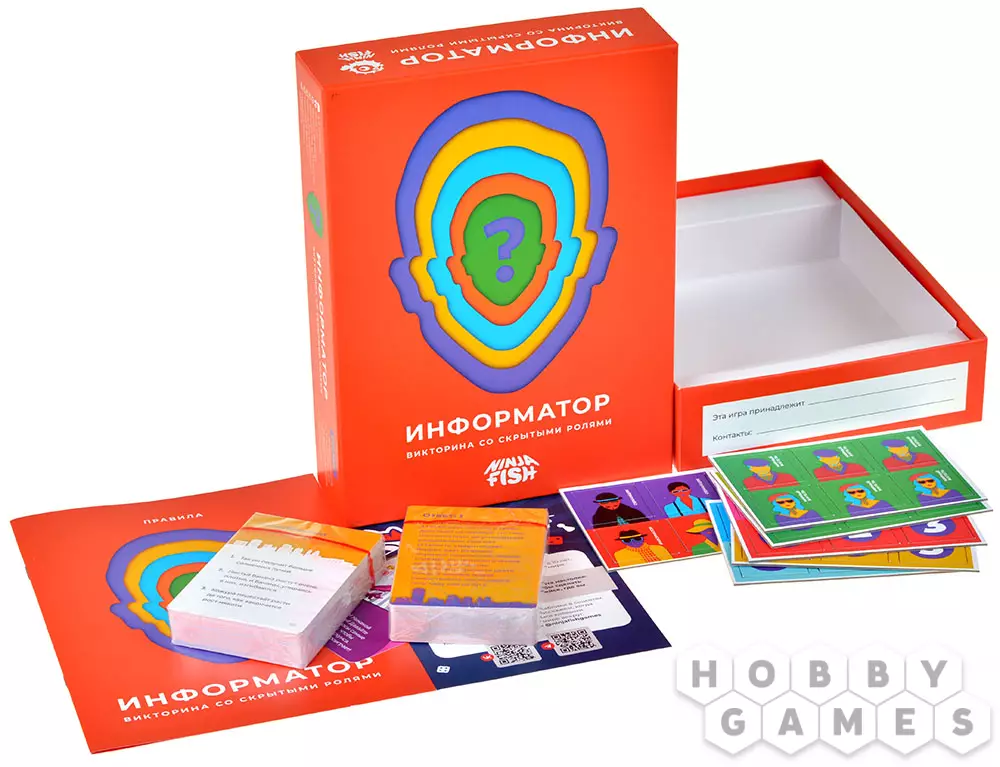"Информатор" – это настольная игра-викторина, в которой у каждого из игроков будут свои роли. Однако роли эти тайные! Держите их в строжайшем секрете. Эту игру от обычной викторины отличает то, что в неё вам потребуются не только знания и эрудиция, но ещё и интуиция, а также навыки дедукции и блефа. Так в чём же заключается добавление тайных ролей в викторину? Всё просто: в процессе игры вы должны будете выбрать один из трёх вариантов ответа на вопрос, но некоторые из игроков уже будут знать правильный ответ. Их задачей будет либо помочь вам ответить верно, либо наоборот навести на неправильный ответ. В конце игры побеждает тот участник, кто за десять раундов наберёт больше всех победных очков.