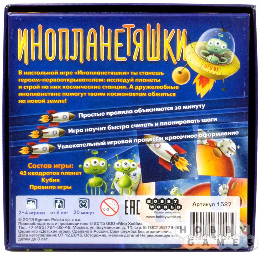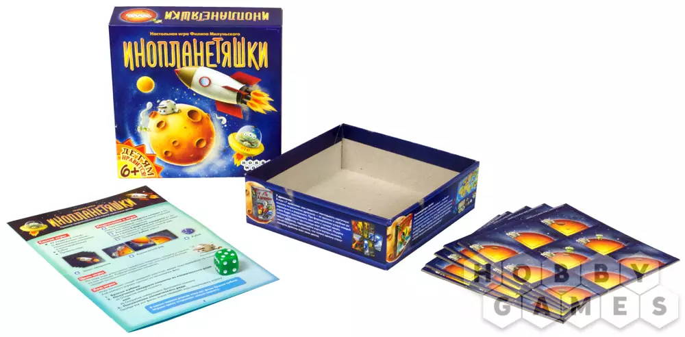 Отлично поиграли! Две недели в течении отпуска в "Инопланетяшек" периодически рубилось от 2 до 5 игроков в возрасте от 6 до 50 лет. В магазине на Менделеевской (спасибо!) мне её посоветовали на вопрос "а для не умеющих читать детей" и с выбором не ошиблись: игра вполне проста, логична, в тоже время не напрягающа и весьма азартна. Рекомендую!