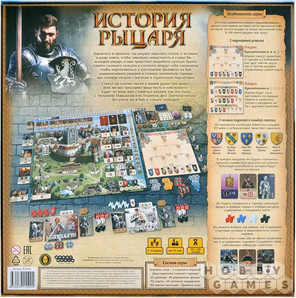 TiboilGame29.12.2022 16:43Я рекомендую тем кто любит сеттинг средневековья. А также тут прекрасный механика турнира и поединка. Это игра дает вам почувствовать настоящим рыцарям, и показывает повседневный дни рыцаря это покупать, охомутать красавицу и за это получить плюшки, нанимать помощников это может быть от неправильных ведьмы до добрых ветеранов турниров, а также дать вызов испытаниям которые вас ждут. Также интересная соло режим которое не даст заскучать, и про рыцари которое являются ИИ, все флаги рыцарей являются историческими подлиным, тут создатели постарались на славу. Советую покупать. Но есть минусы, я не советую покупать если вы не любите: долгое подготовка, бросков кубов вовремя поединка а также небольшие нюанс в правилах. Я старался для этого отзыва быть предельным объективны. Желаю вам хороших партий)