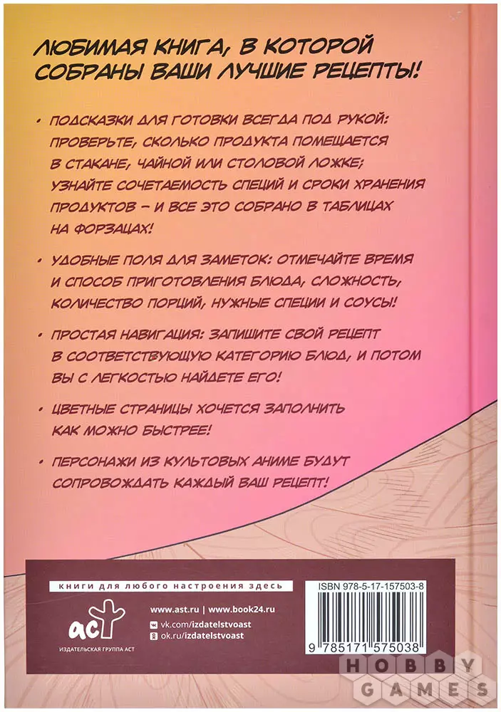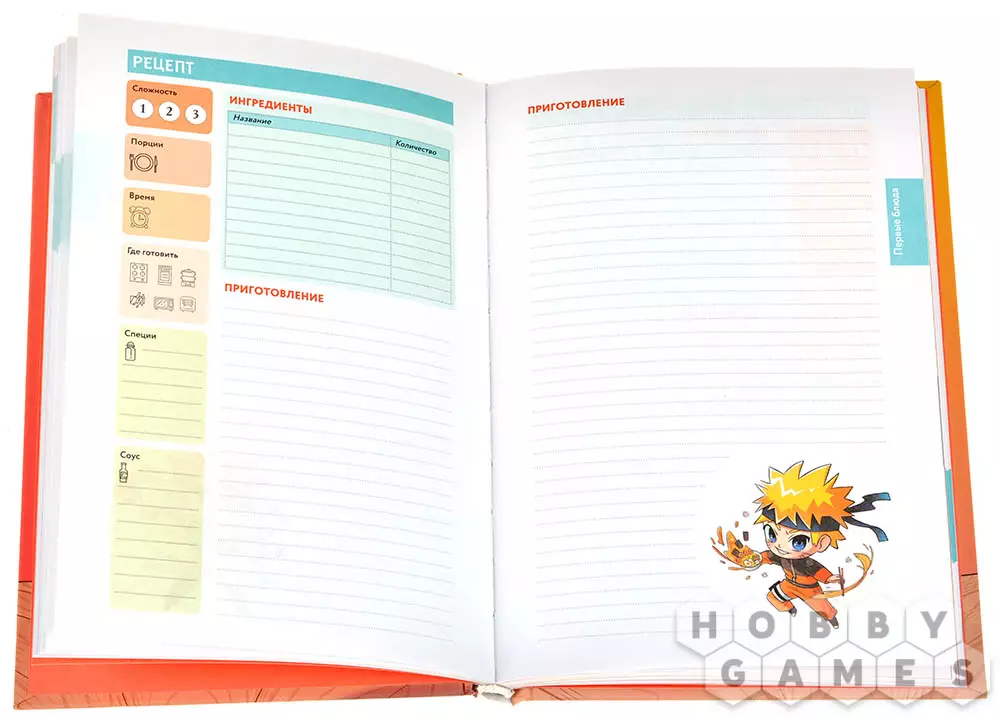 Детали важны! Записывайте рецепты с удовольствием, а помогут вам в этом удобные поля для заметок. На них приятно отмечать время и способ приготовления, количество получившихся порций, приправы и соусы – и ваш обеденный стол будет всегда на высоте. Помимо этого, каждая страничка ваших вкусных историй будет сопровождаться персонажами из любимых аниме!