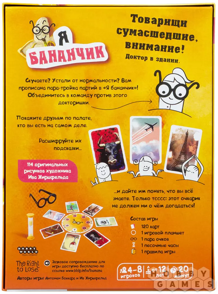 "Я бананчик" – весёлая "сумасшедшая" игра для шумной компании, рассчитанная на взаимодействие между игроками. Цель игры для каждого участника зависит от роли, которая ему достанется. Каждый из игроков-"пациентов" считает себя тем, кто или что изображено на одной из карт личностей. Пациенты играют в одной команде и жестами объясняют друг другу, кем или чем они себя считают, но делают это так, чтобы доктор не догадался! Тот, кто становится "доктором", играет против всех остальных участников и должен угадать, кто есть кто.