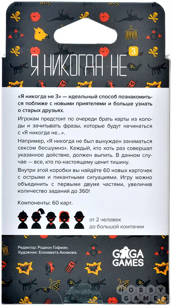 В колоде содержится 60 карт с весёлыми ситуациями, которые можно объединить с первой и второй частями, чтобы увеличить количество заданий до 360. В "Я никогда не 3" можно играть компанией от двух человек! А что вы "никогда не!"?