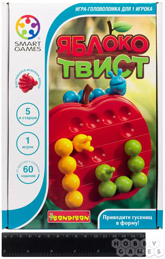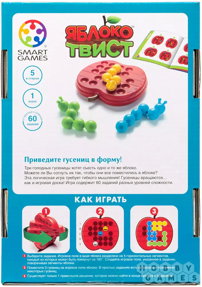 В настольной игре "Яблоко твист" вам предстоит разделить яблоко между тремя гусеницами: вращайте их, подобно в танце твист, и размещайте на игровом поле, чтобы всем хватило места. Выполните все 60 заданий, переходя от простых к более сложным. Игра компактная, её можно взять с собой куда угодно, чтобы скука не настигла вас в дороге.