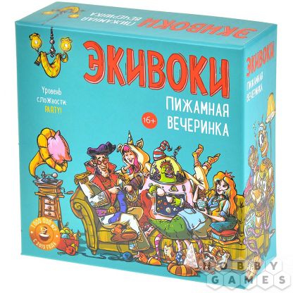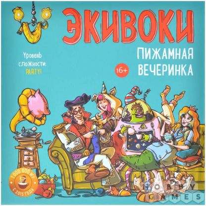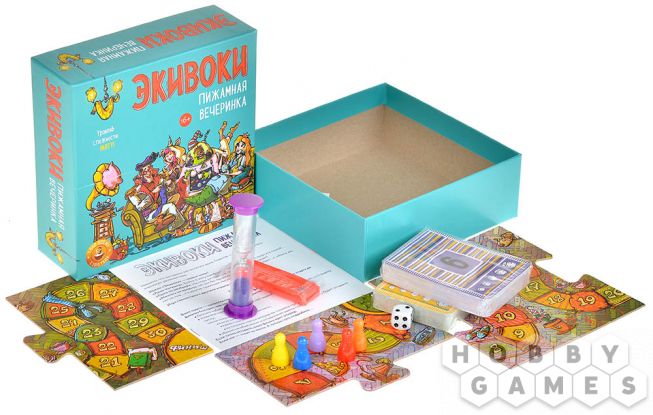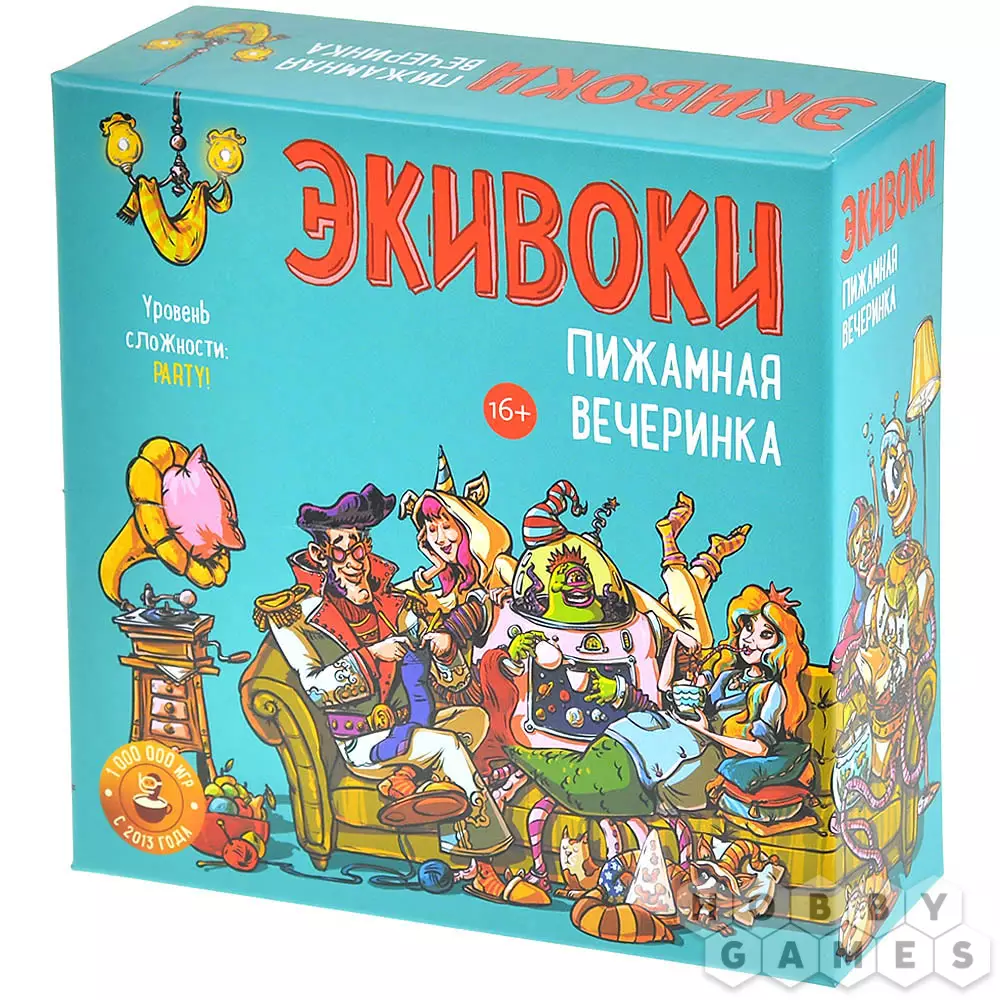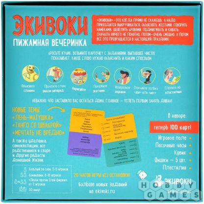 "Экивоки. Пижамная вечеринка" – это новая игра из серии "Экивоки", которая содержит 100 новых карточек со словами на темы "Мечтать не вредно", "Танго со шваброй" и "Лень-матушка". "Экивоки" – серия игр для компании, в которой нужно объяснять слова с помощью пения, рисования, лепки из пластилина и других интересных способов. А ключевой момент, который привлекает любителей патигеймов – это слова на карточках, старательно подобранные разработчиками игры, чтобы сделать вашу игру максимально уютной и весёлой. Игра посвящается времени, проведенному в стенах дома, независимо от того, что послужило для этого причиной: интроверсия, болезнь или просто леность. Да и какая разница? Главное поскорее занять стратегическую позицию – диван. В коробке вы найдёте всё необходимое для игры, добавить нужно только аксессуары для рисования, например, карандаш и чистый лист бумаги. Игра рекомендуется вместе с "Экивоки. Мама запретила" и хорошо сочетается с другими играми серии "Экивоки".
