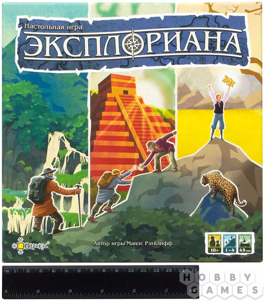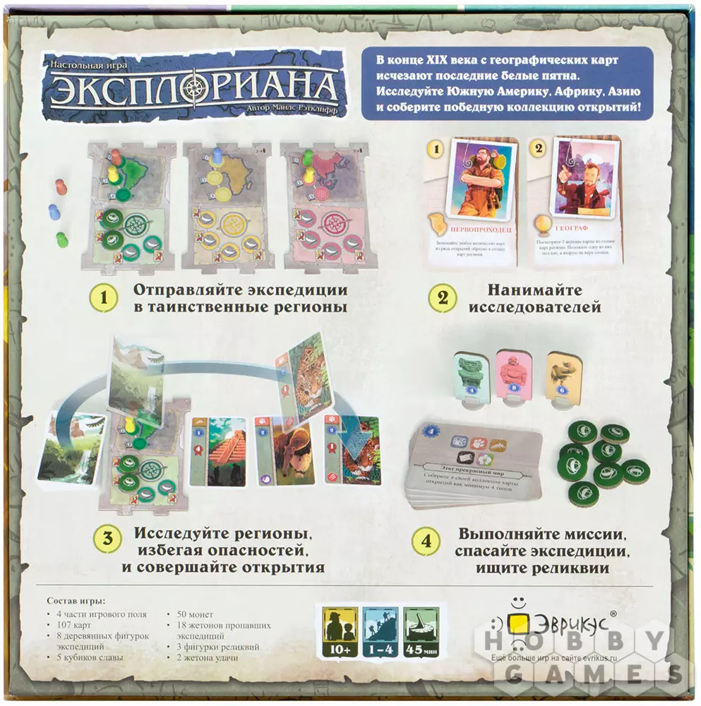 "Эксплориана" – это настольная стратегия, в которой игроки возглавят один из научно-исследовательских институтов и будут формировать и отправлять экспедиции в экзотические страны. Такие экспедиции позволяют открывать и исследовать новые виды растений и животных, а также заполнить географические карты точными данными. Но экспедиция – это не безопасная прогулка за городом, и успех ждёт лишь самых упорных, тех, кто готов выдержать опасные и сложные испытания. Африка, Азия и Америка ждут вас!