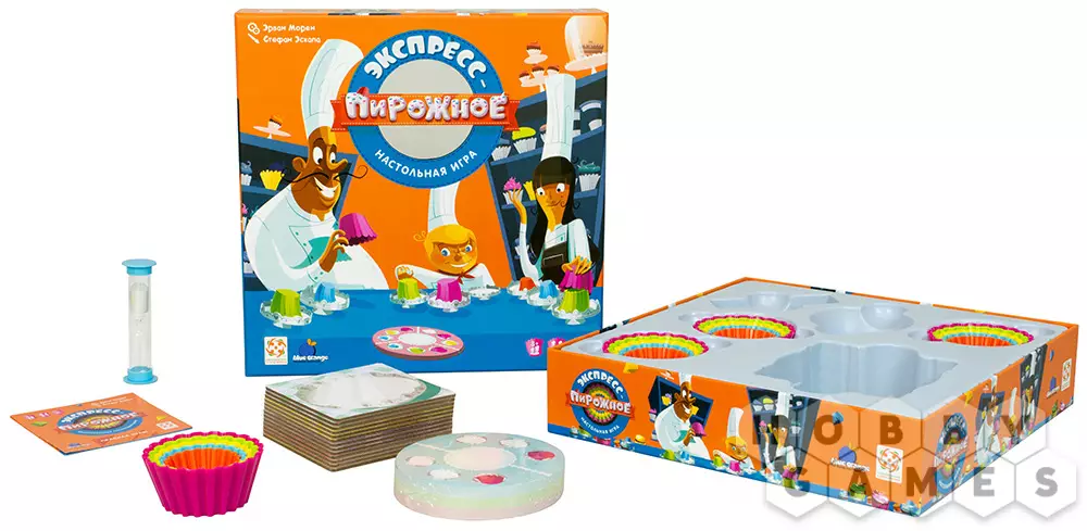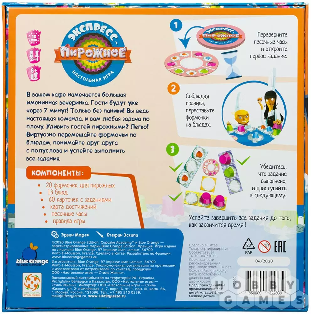 Игровая партия длится семь минут, отмерить которые помогут идущие в комплекте песочные часы. Цель игры заключается в расставлении формочек разных цветов и размеров согласно обозначенному заданию. Расслабляться нельзя, ведь как только вы выполнили одно задание, необходимо сразу браться за следующее! Секрет успеха в "Экспресс-пирожном" – слаженная командная работа и умение быстро принимать решения. Необходимо не только следить за своими пирожными, но и помогать другим игрокам, ведь победы можно добиться только совместными усилиями. И не забывайте: в ходе игры пользоваться можно только одной рукой!