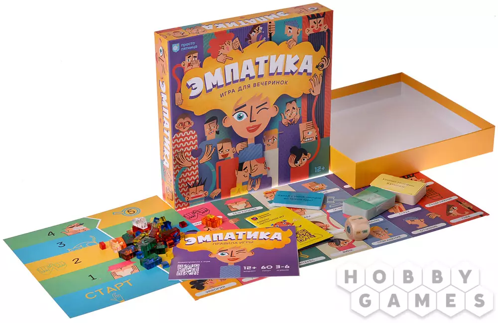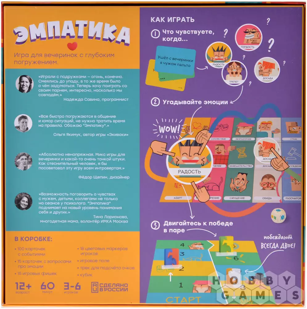 "Эмпатика" – игра для весёлой компании, в которой вы узнаете, насколько совпадают ваши эмоции и чувства! Каждый раунд ведущий будет определять ситуацию при помощи нескольких колод карт. В игре представлены самые разные щекотливые ситуации, что способны вызвать множество эмоций: как бы вы отреагировали, если бы осознали, что ушли с вечеринки в чужом пальто? А если бы ненароком утопили телефон в унитазе, что бы чувствовали: обиду, печаль, замешательство, гнев или что-то ещё?
