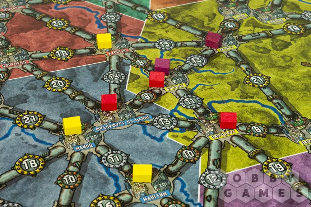 Стройте сети и подключайте города. Как и в предыдущей фазе, порядок хода разыгрывается с конца. Игроки могут за определённую плату подключать к своей сети незанятые города. Ваша сеть – это совокупность всех подключённых к ней городов.