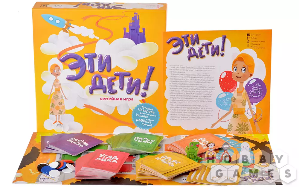Уважаемые родители! Встречайте семейную настольную игру от Татьяны Лазаревой! Наверняка вам знакома занимательная телевикторина "Это мой ребёнок", где семейные пары вели борьбу за главный приз, и выигрывали в результате те родители, которые хорошо знают и понимают своего ребёнка. С игрой "Эти дети!" вы тоже сможете проверить свои знания о характере, привычках и увлечениях драгоценного чада.