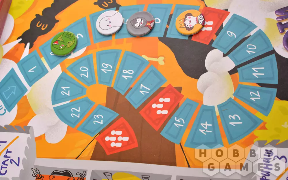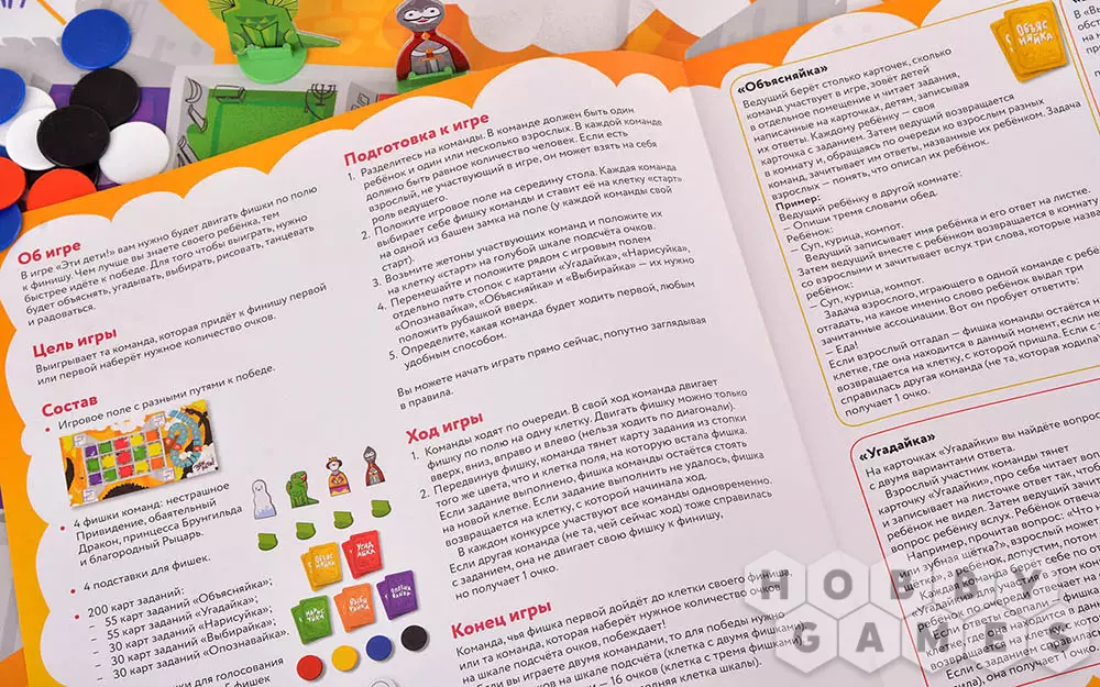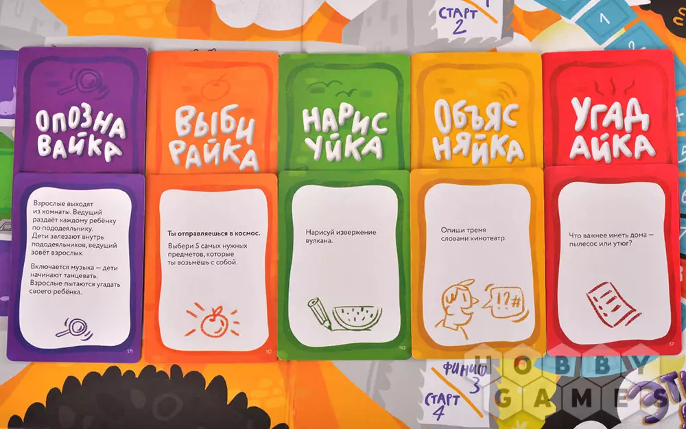 Итак, перед началом игры участники делятся на команды с равным количеством человек, причём в каждой команде должен быть один ребёнок и как минимум один взрослый. Каждая команда, выбрав фишку и взяв соответствующие жетоны, отправляется на стартовую клетку. Рядом с игровым полем располагаются пять стопок игровых карт с заданиями. В свой ход, передвинув фишку на одну клетку, команда берёт карточку задания соответствующего цвета. В зависимости от того, удалось ли команде выполнить задание, фишка остаётся на месте или возвращается назад. Другие команды в этом конкурсе также выполняют то же самое задание, и в случае успеха получают по одному победному очку.