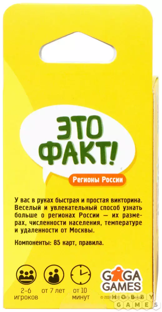 Третья игра из серии азартных карточных викторин "Это Факт!". Насколько хорошо вы разбираетесь в субъектах Российской Федерации? "Это Факт! Регионы России" знакомит вас и ваших детей с регионами нашей необъятной родины. Численность населения, удалённость от Москвы, символы, среднегодовая температура и многое другое. Узнайте больше о матушке России!