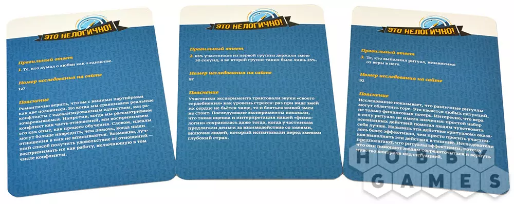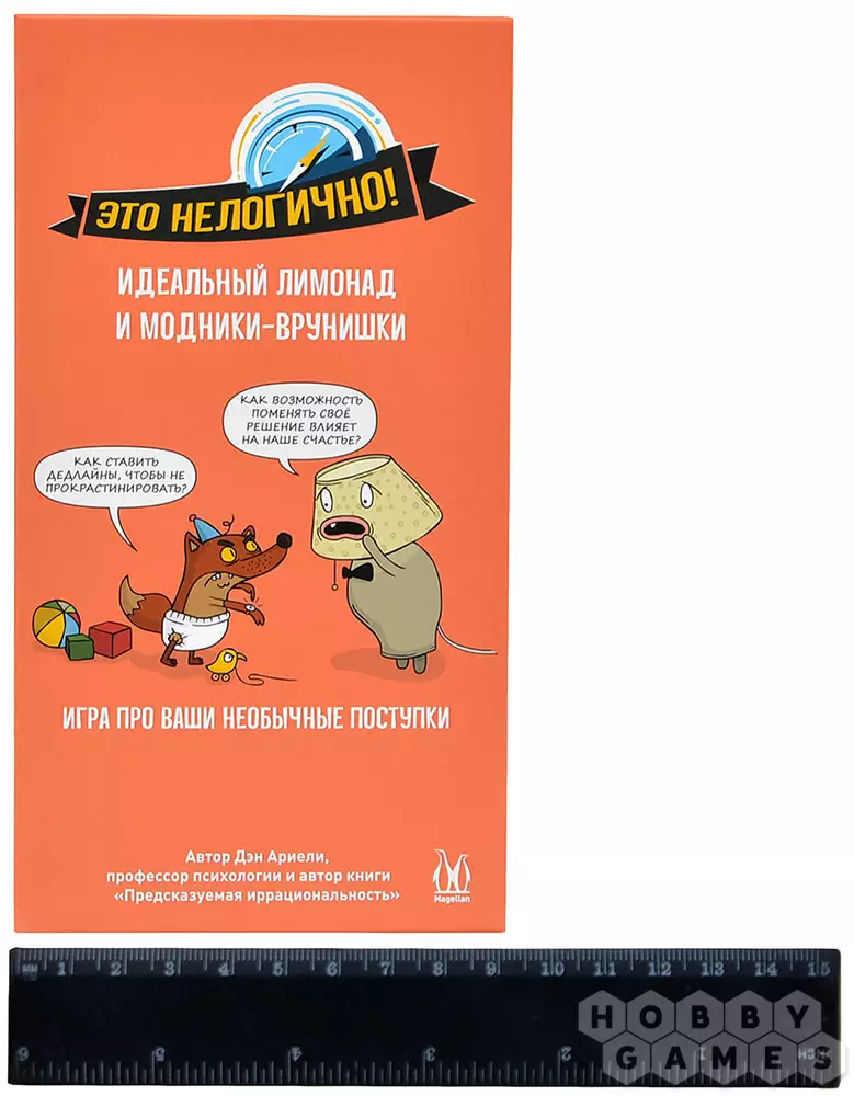 "Это нелогично! Идеальный лимонад и модники-врунишки" – это карточная настольная игра, основанная на настоящих социологических исследованиях. В коробке 63 карты, вам и вашим друзьям предстоит проанализировать ситуации, описанные на карточках, и постараться понять, как повело себя большинство участников исследования: четыре варианта ответа на один вопрос. Трижды ошиблись? Увы, вы проиграли. Дали 5 правильных ответов – вы выиграли! Но если всё-таки трижды ошиблись, не расстраивайтесь и попробуйте ещё раз.