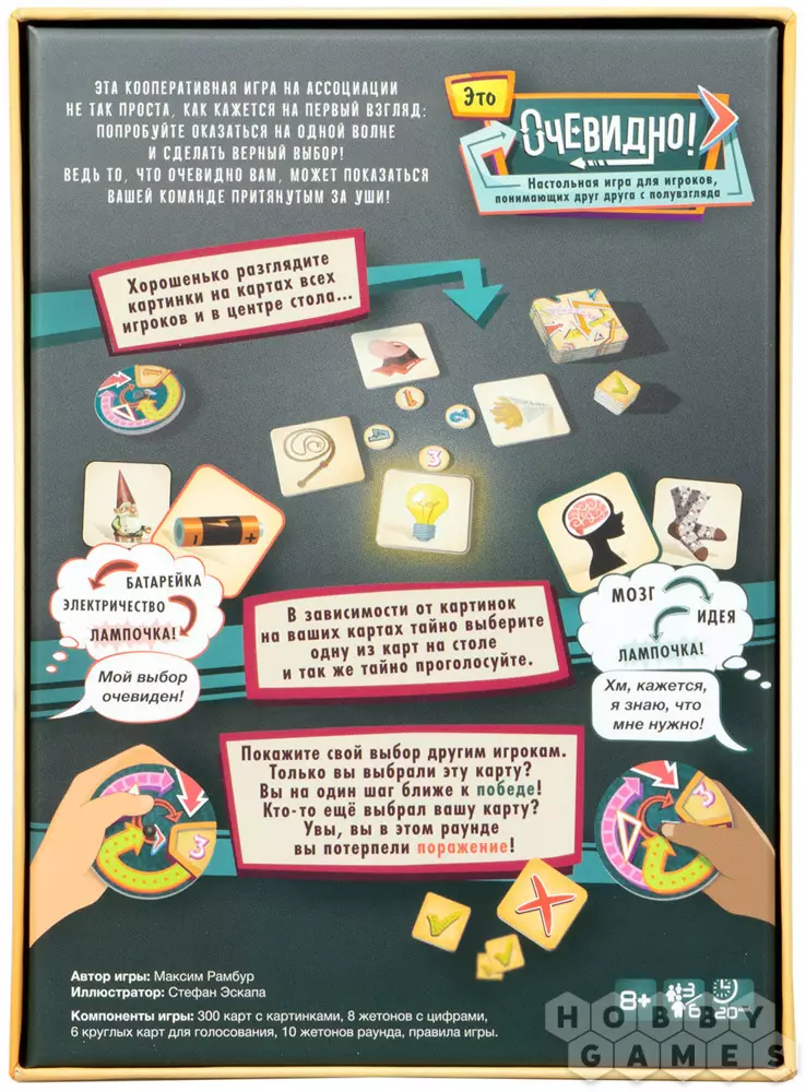 В настольной кооперативной игре "Это очевидно!" вы сможете проверить, насколько хорошо понимаете мысли друг друга. Эта игра на ассоциации к картинкам, во время которой вы не сможете свободно общаться с другими игроками: в центре стола лежат 5 карт, а перед игроками лежат по 2 карты. Вы тайно выбирает одну из карт в центре стола, но ваш выбор не должен совпадать с выбором другого игрока! На первый взгляд очевидный выбор для вас, для другого игрока может показаться абсолютно притянутым за уши. Выбрали карту? Сообщите об этом остальным, сказав "Ну это очевидно!" Далее на диске для голосования вы выбираете номер карты, которая соответствует выбранной вами карте. Если ничей выбор не совпал, поздравляем! Раунд остаётся за вами. Если сплоховали – получаете жетон ошибки, но постарайтесь больше так не делать...