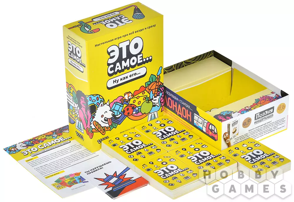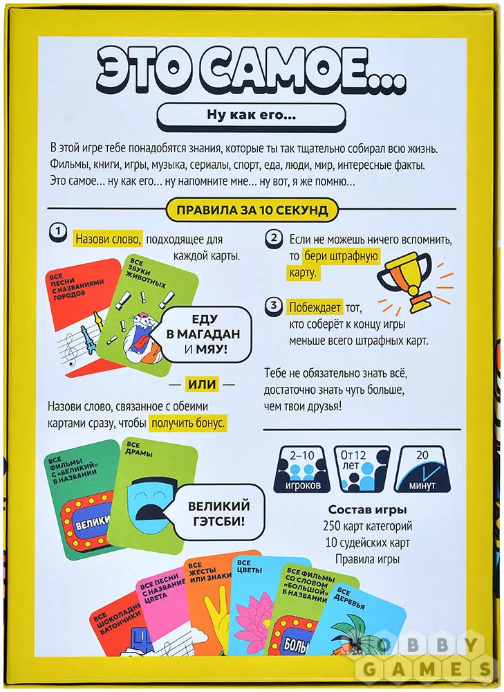 "Это самое..." – карточная игра, в которой вы будете тянуть карты категорий. Для каждой из них нужно будет подобрать подходящее слово. А если вы сможете придумать одно слово, уместное для обеих карт, то получите бонус! Не справились? Штраф! А точнее, штрафная карточка. Берегитесь: наберёте слишком много – и проиграете. Ведь победит тот, у кого их будет меньше всего...
