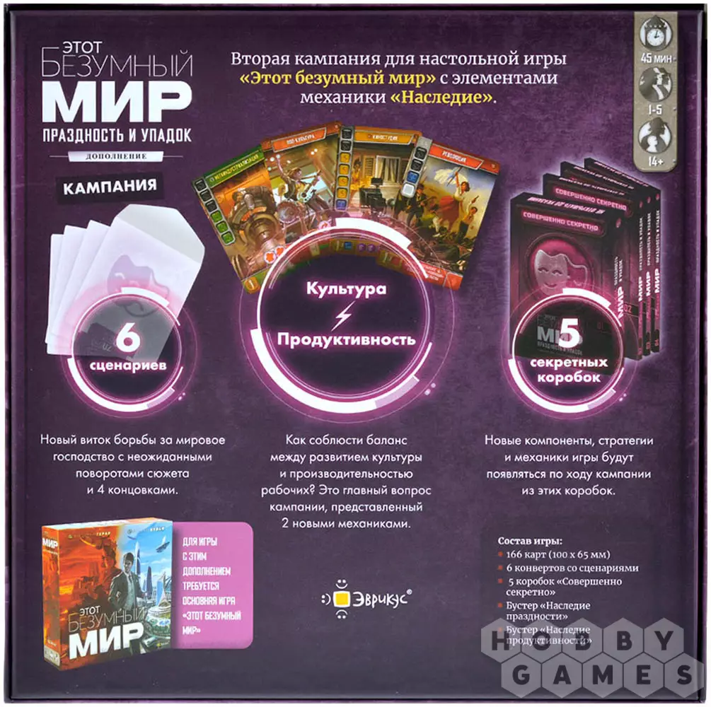 Темой второго сюжетного дополнения настолки "Этот безумный мир" стали праздность и упадок. Добавлена новая кампания, состоящая из 6 различных сценариев, вдохновленных идеей культурного развития и его влияния на судьбу империй. Вам предстоит принимать решения, которые определят будущее вашей империи в этом мире изобилия и праздности. Куда стремится мир, в котором все обретут процветание и жизнь в полной гармонии? На этот вопрос вам нужно ответить в процессе игры. Второе дополнение больше и богаче его предшественника "Война или мир", оно включает в себя несколько сюжетных развилок, пара бустеров и компонентов.