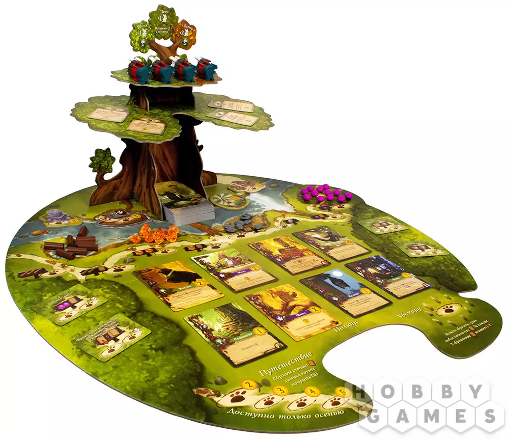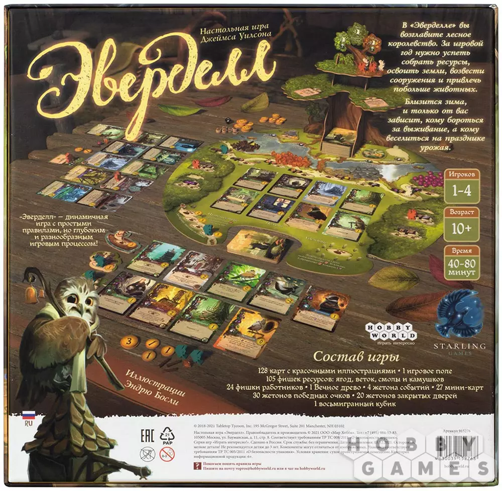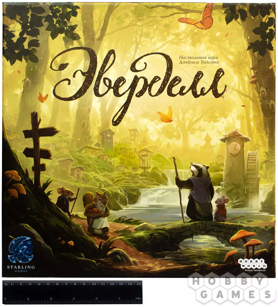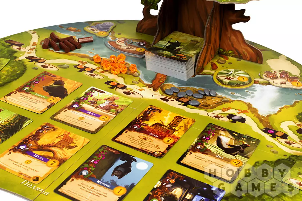 "Эверделл" – это волшебная настольная игра для 1-4 игроков и само воплощение тепла и уюта. Действие игры происходит в сказочном мире, где животные разговаривают и дружно живут вместе в лесных городах. Прежде всего, игра удивит Вас своим очаровательным дизайном игрового поля и компонентов, в которых используются мягкие и приятные цвета. Во главе игрового поля стоит настоящее дерево, которое нужно будет собрать по инструкции из картонных элементов. Дерево не просто выполняет декоративную функцию – на его ветвях располагаются карты и фигурки.