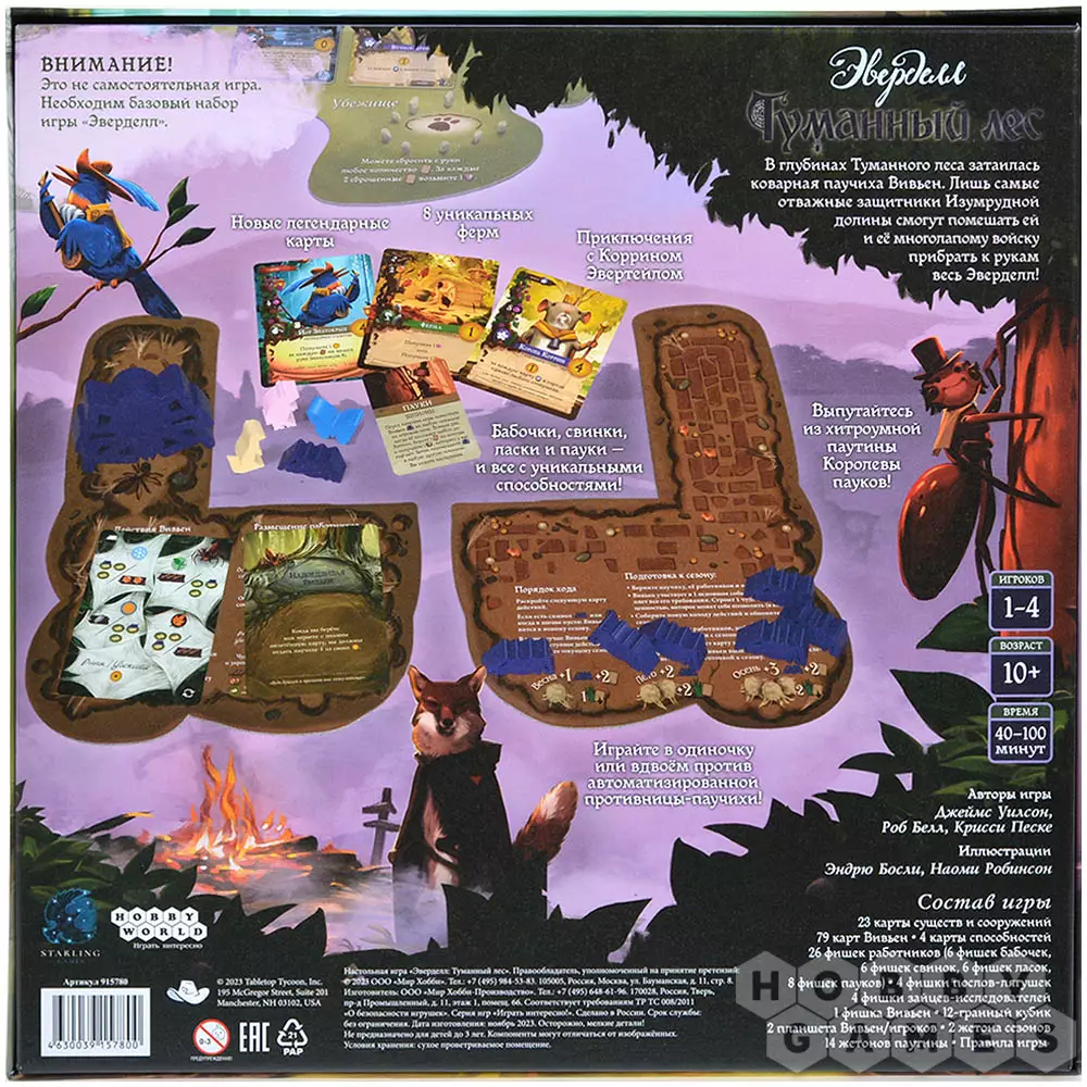 "Эверделл: Туманный лес" – это дополнение, в котором вам предстоит столкнуться лицом к лицу с автоматизированным противником – паучихой! Противостоять ей вы можете как в одиночку, так и в компании своего друга. Но это не всё. В комплекте вас ждут 8 уникальных ферм, новые легендарные карты, а также пауки, бабочки, ласки и свинки – все со своими особенностями! Преобразите долину и сделайте ваши партии в "Эверделл" ещё более разнообразными!