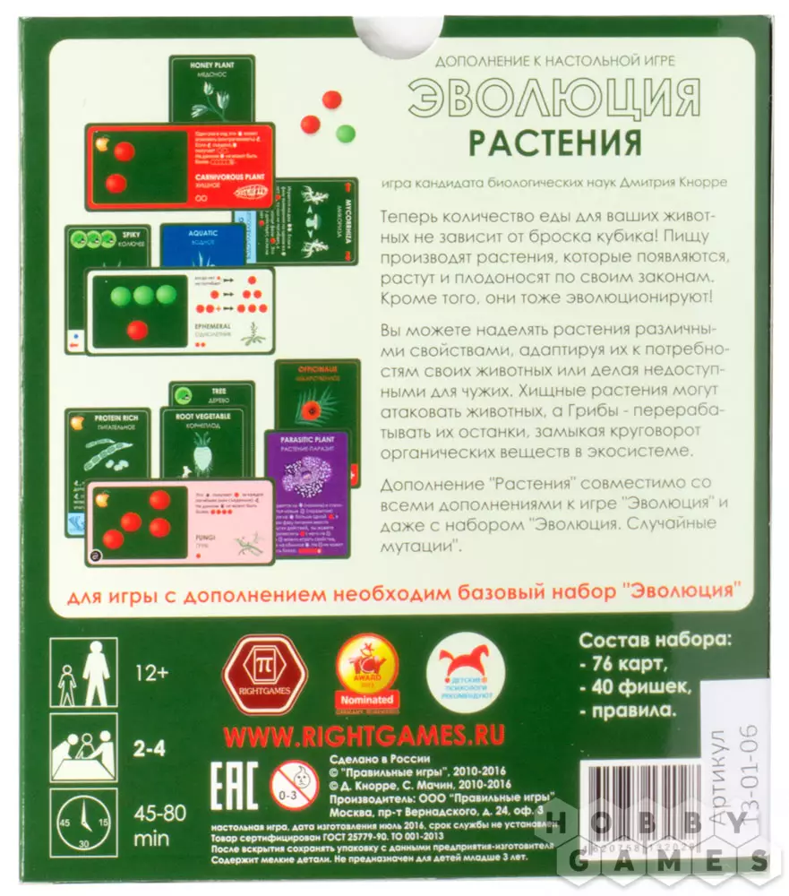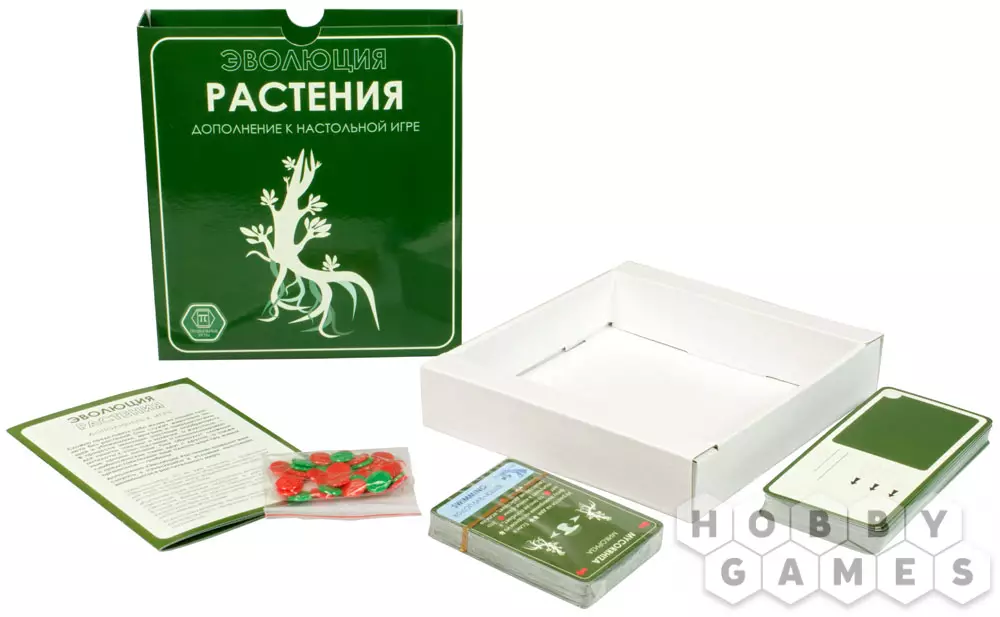 "Эволюция. Растения" – третье дополнение к научно-популярной игре "Эволюция". Это дополнение совместимо со всеми играми и дополнениями серии. В правилах описываются важные моменты по взаимодействию "Растений" и других игр серии "Эволюция".