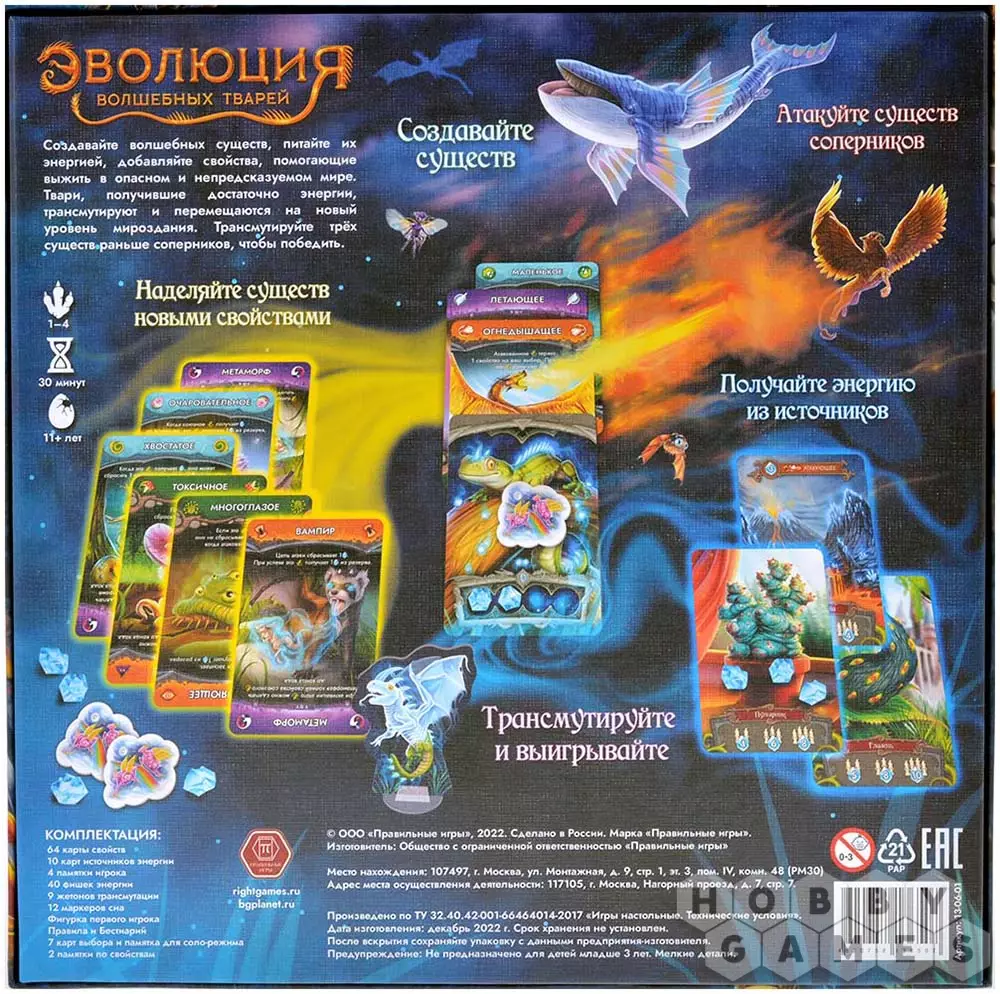 "Эволюция волшебных тварей" – это продолжение и переосмысление хитовой игры "Эволюция". Как и в оригинале, ваша задача – развивать своих существ, делая их всё более совершенными и добавляя им уникальные свойства. Каждый игрок управляет развитием конкретного волшебного существа, наделяя его способностями и изменяя по мере необходимости. В отличие от классической игры, здесь для победы не нужно набрать больше всех победных очков, а ваши существа не могут умереть – в определённый момент они трансмутируют, превращаясь в новые виды! Победит игрок, что первым трансмутирует существо трижды.