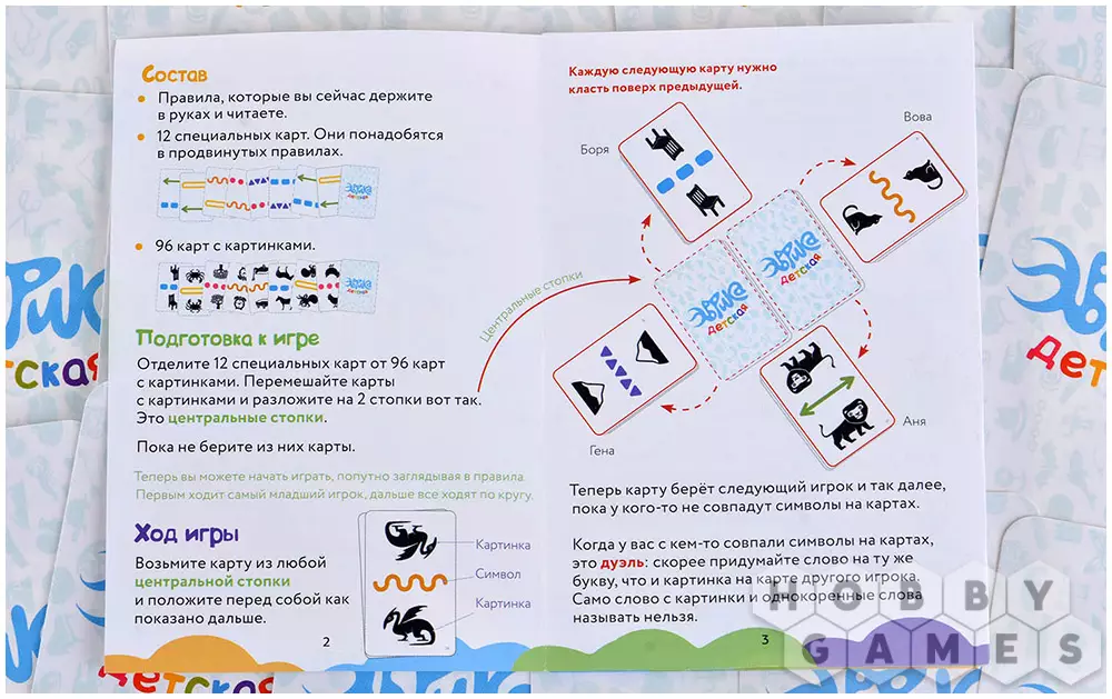 В центре игрового стола выкладываются две колоды карт. Игроки по очереди переворачивают верхнюю карту из стопки и быстро кладут рядом. В первую очередь нужно обратить внимание на цветные символы на картах. Если игрок видит такой же символ, как на своей карте, он смотрит на карту соперника, а точнее, на то, что там нарисовано. Допустим, на его карте нарисовано дерево. Значит, требуется назвать слово на букву "Д". А соперник, в свою очередь, видит, что на чужой карте нарисовано яблоко и вспоминает слово на букву "Я". Кто из двух игроков быстрее назвал правильное слово, тот и себе забирает карту соперника в качестве победного очка. После окончания колоды карты игроков подсчитываются и побеждает тот, кто набрал больше всех очков.