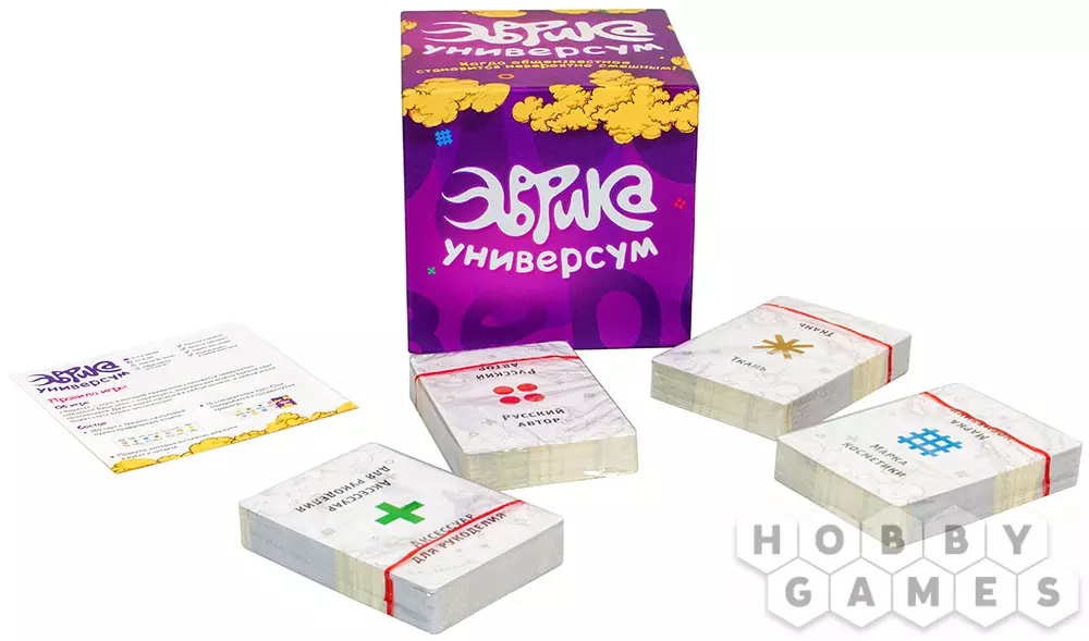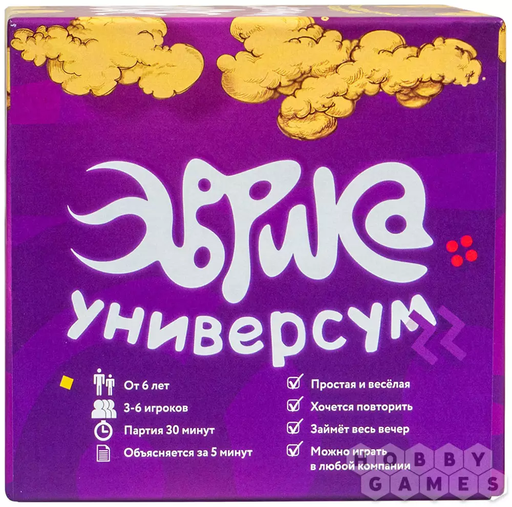 "Эврика Универсум" – настольная игра, в которой привычное становится невероятно смешным. Правила весьма простые: необходимо разделить колоду игровых карт на две стопки, после чего участники по очереди вытаскивают по одной карте и кладут на стол лицевой стороной вверх. Карты открываются до тех пор, пока не обнаружатся совпадения символов у двух игроков. Тогда каждый из них должен назвать слово, подходящее к определению на карточке соперника. Кто справился с этой задачей первым, тот забирает карту соперника себе и кладёт её в стопку своих победных очков. Также в колоде попадаются специальные карты, на каждой из которых изображено уже по два символа, что увеличивает шанс совпадений и уже не два, а больше игроков включаются в словесный поединок.