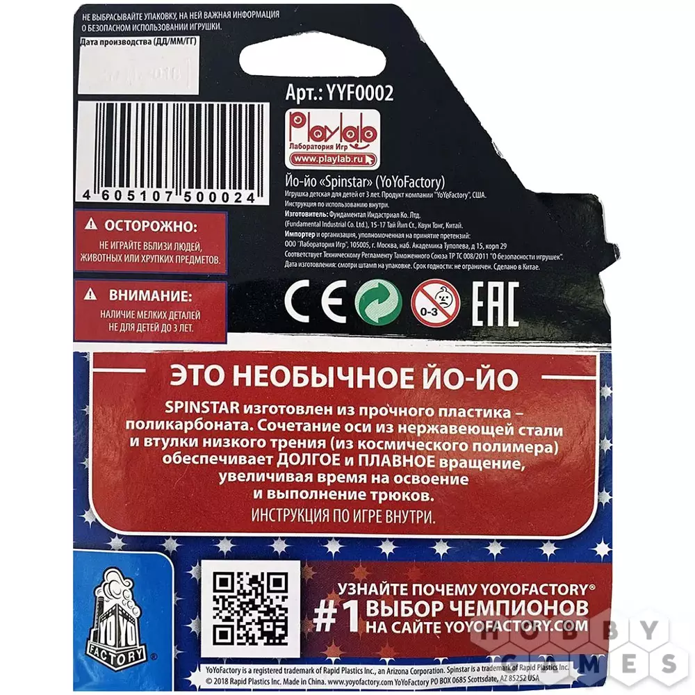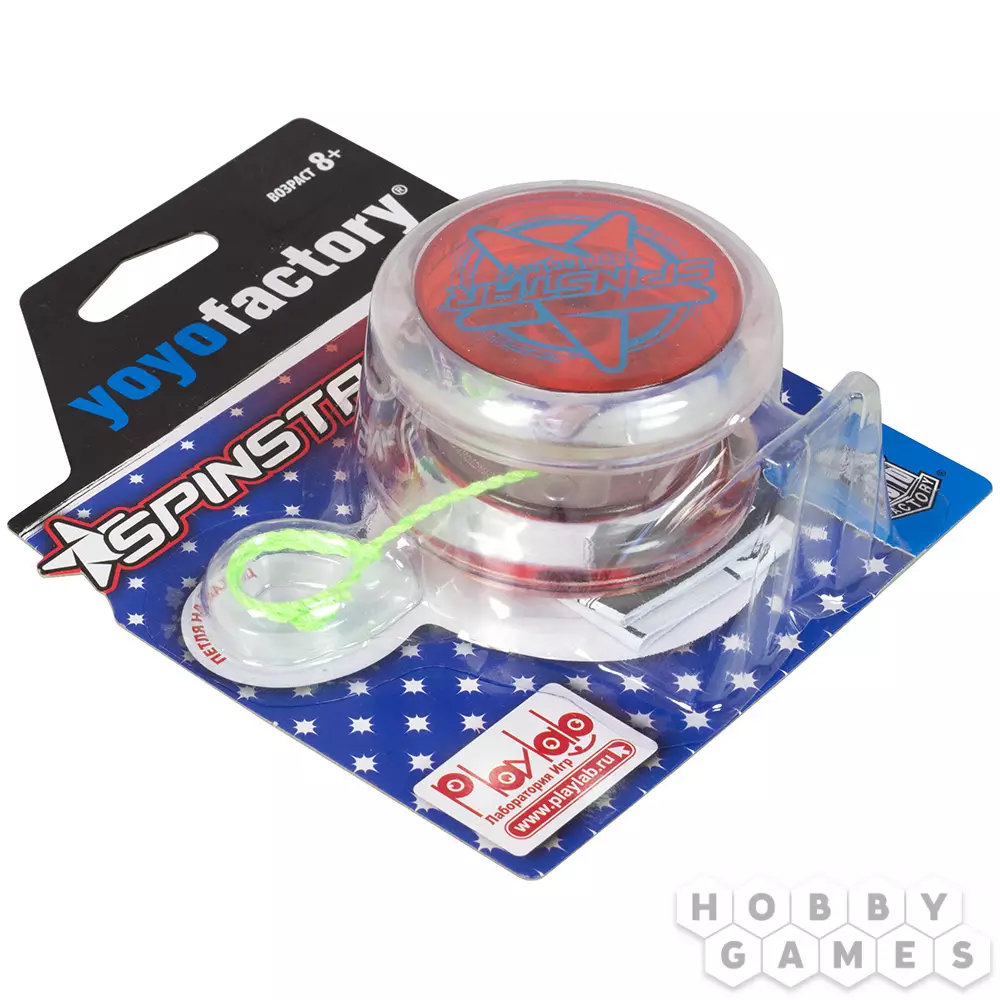 Команда YoYoFactory производит высококачественные профессиональные йо-йо для чемпионатов, и известна ими по всему миру. Корпус SpinStar создан из прочного пластика – поликарбоната, вместо стандартного подшипника в йо-йо установлена втулка со стальной сердцевиной, а тормозная система абсолютно не требует ухода. Данная модель легка в обращении и подходит для изучения различных трюков.