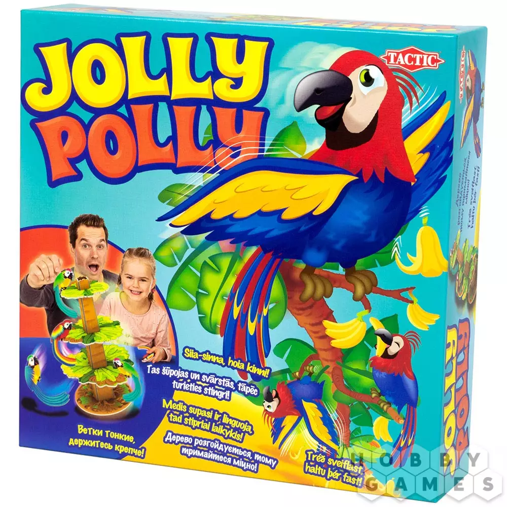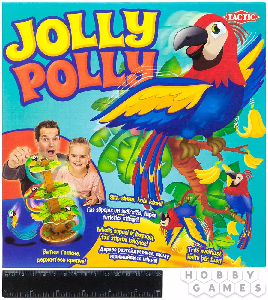 Jolly Polly – весёлая игра для детей с тропическим антуражем. На пальме выросло много бананов, и попугаи слетелись на пир со всей округи! Но дерево не готово к тому, что на него усядется такая орава, и сильно раскачивается, когда на него садится очередной пернатый говорун. Ваша задача – усадить всех своих попугаев на дерево в порядке, который определяют правила игры. Когда вы сажаете на пальму последнего попугая – вы побеждаете. Но будьте осторожны: если, сажая своего попугая, вы уроните чужих – вам придётся забрать и заново усаживать упавших птиц.