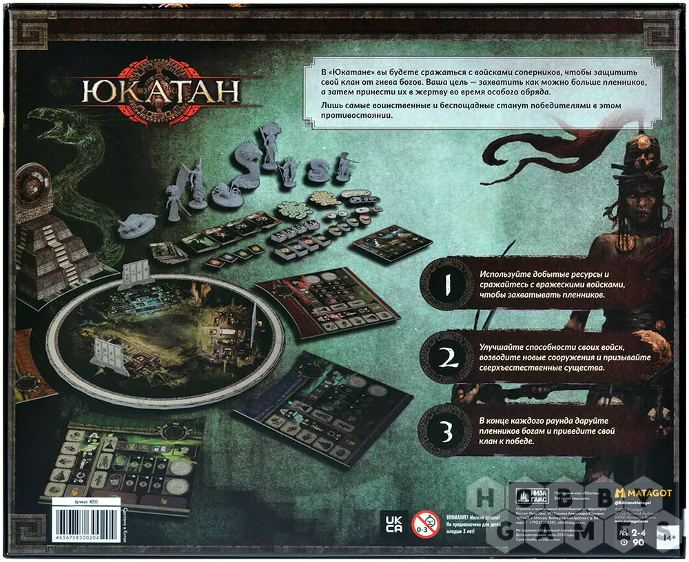 "Юкатан" – это настольная игра с механикой контроля территорий. В ней вам предстоит контролировать один из кланов народа майя и сражаться с армиями соперников, дабы защитить свой народ и свой город от гнева богов. В процессе атак вы будете брать в плен вражеских воинов с целью принести их в жертву во время особого обряда. Успешные ритуалы принесут вам немало выгоды, но и соперники тоже не будут стоять на месте: одной из особенностей "Юкатана" является то, что игрокам выгодно становиться мишенью других игроков, ведь проигравший бой получает определённые бонусы.